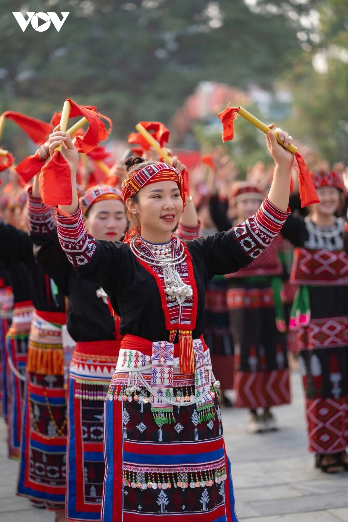 | Các dân tộc đã thế hiện những điệu múa như: múa chạy cờ, múa kiếm, múa chuông, múa võ, múa lao động sản xuất... |