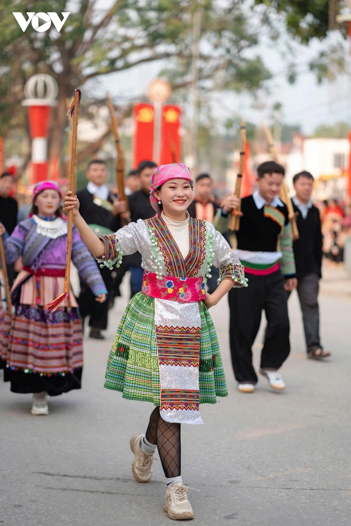 | Các chàng trai, cô gái dân tộc Mông trên địa bàn huyện Văn Yên tham gia diễu diễn đường phố |