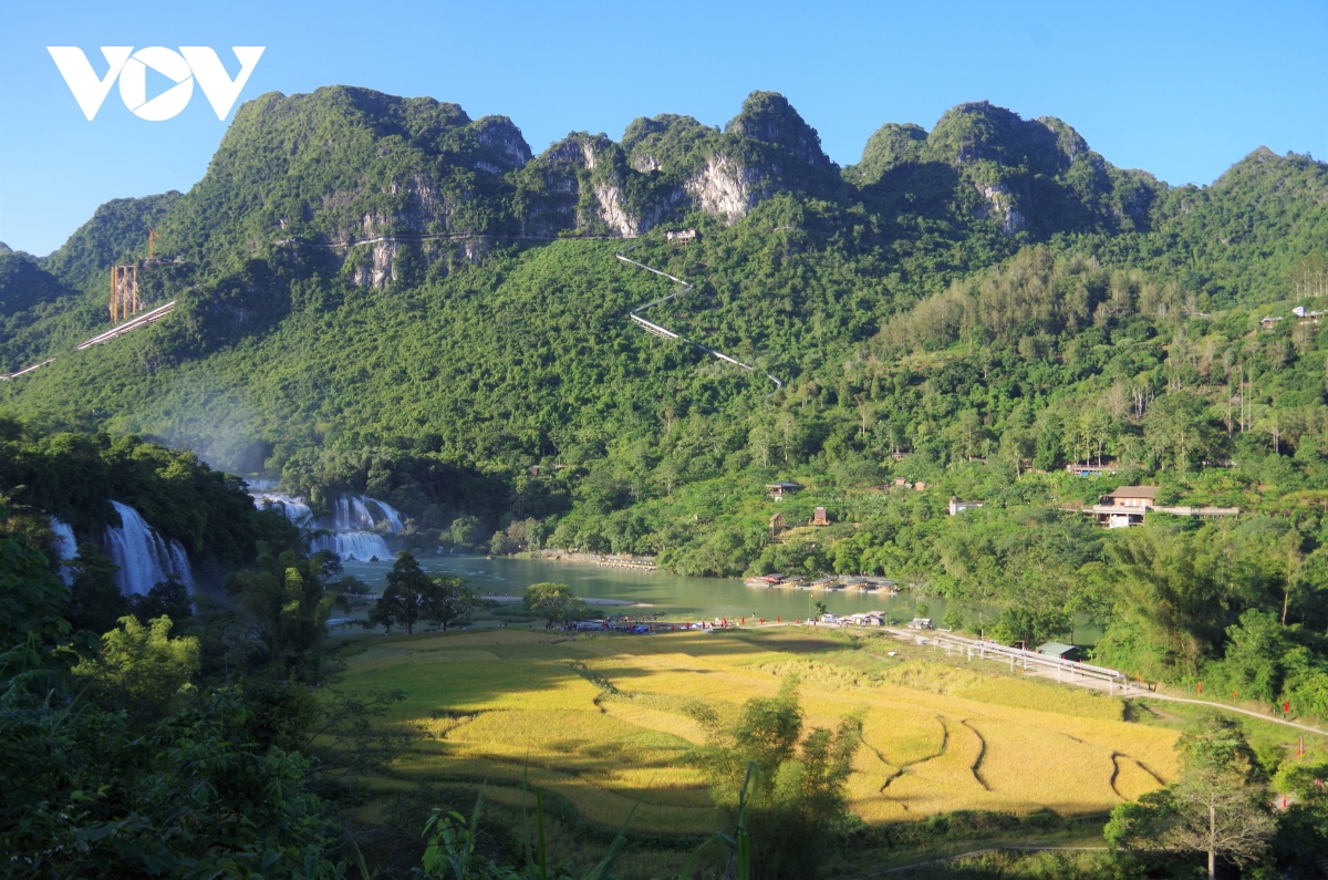 Thác Bản Giốc nằm ở xã Đàm Thủy, huyện Trùng Khánh, Cao Bằng. Đây là một danh thắng nằm giữa biên giới Việt Nam - Trung Quốc và là thác nước lớn nhất Đông Nam Á. Thác Bản Giốc mùa thu được đánh giá là đẹp nhất trong năm với nắng nhẹ, làn nước trong xanh bên những thửa ruộng lúa chín vàng. |