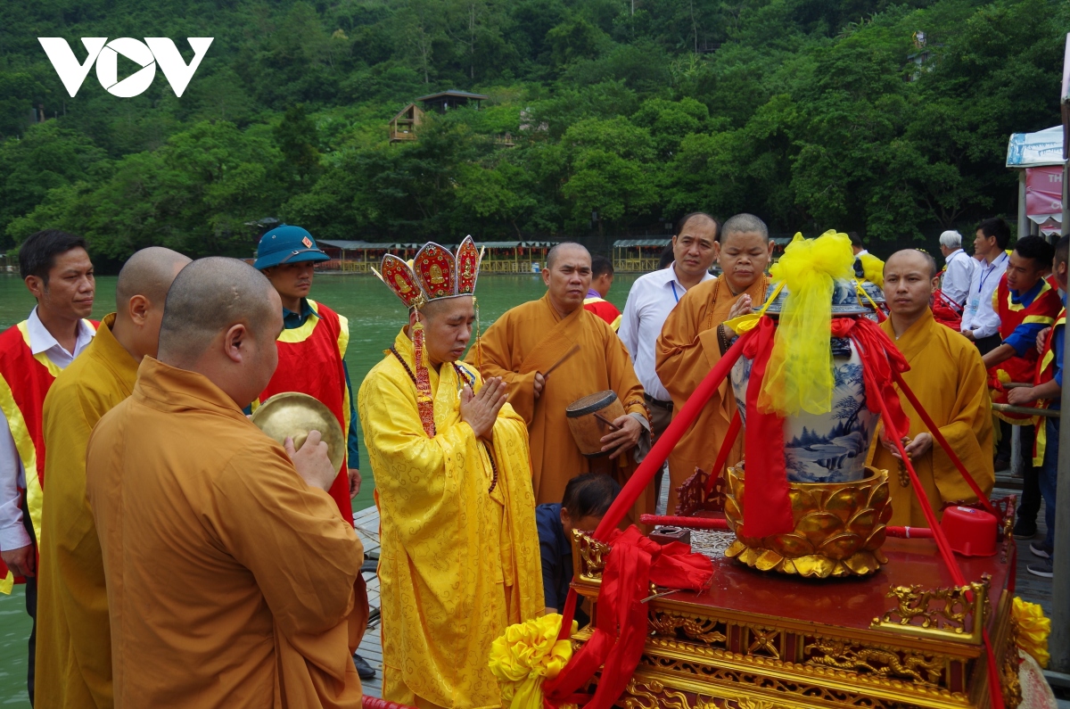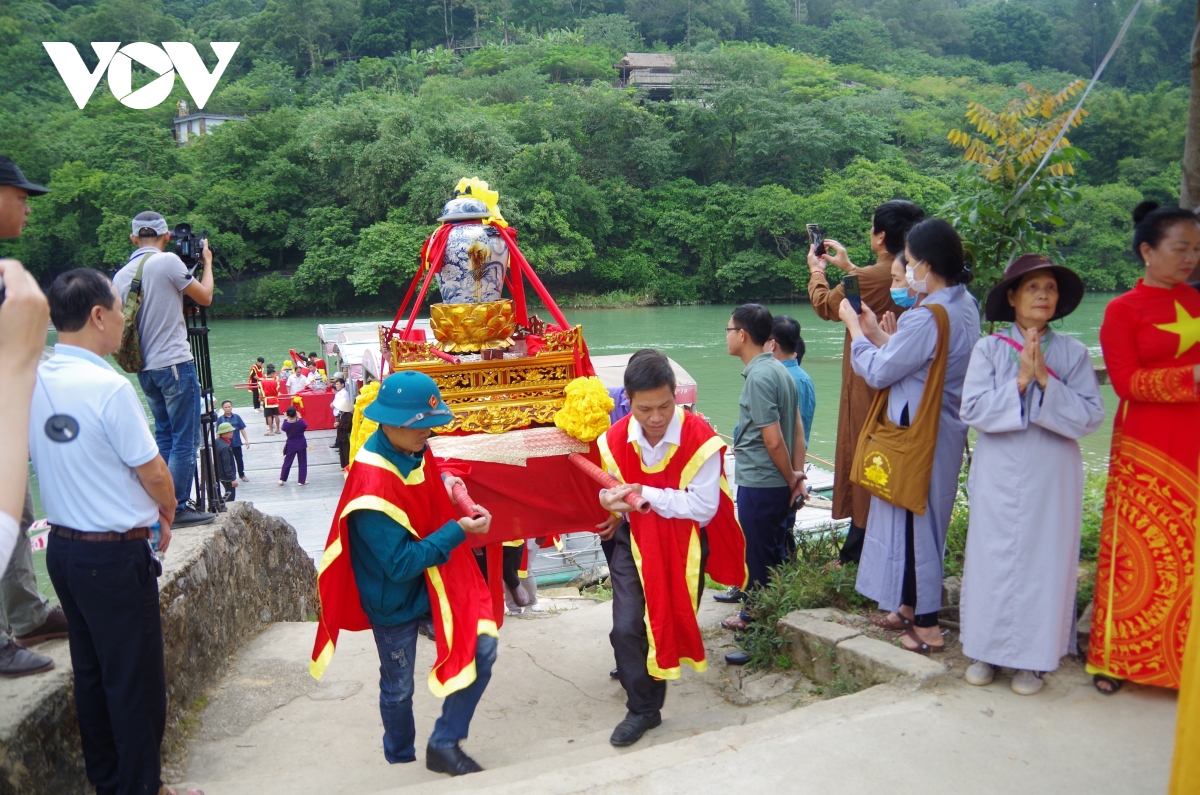 Rước nước từ bến sông lên chùa Phật Tích Trúc Lâm Bản Giốc. |
