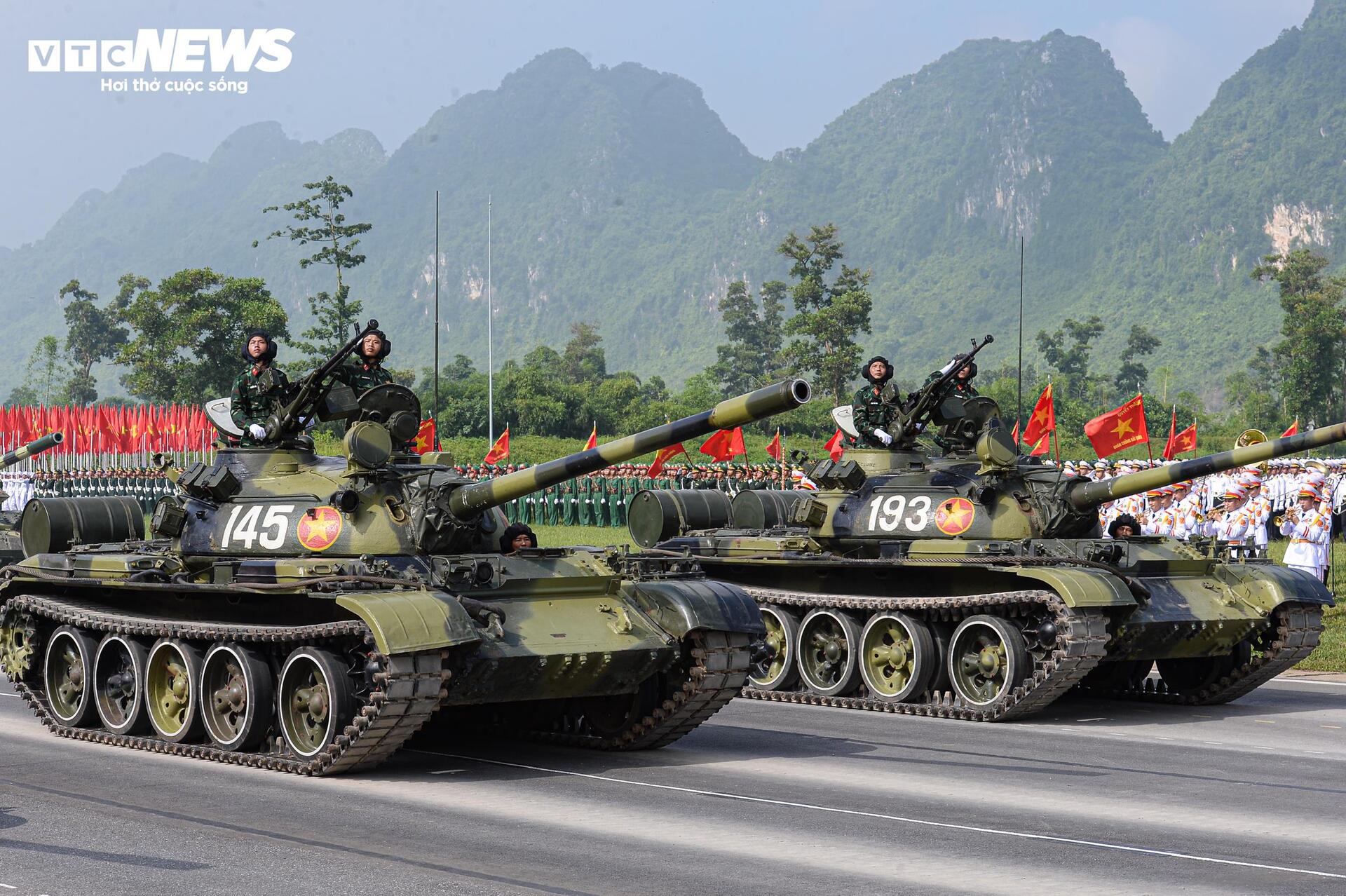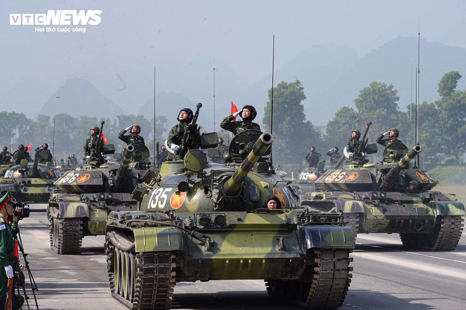 | Đặc biệt, đây là lần đầu tiên các khối xe tăng, xe thiết giáp, pháo binh, tên lửa được tổng hợp luyện cùng đội hình khối bộ binh, tạo nên khí thế hào hùng và sức mạnh tổng hợp trên thao trường. (Trong ảnh là đội hình xe tăng với sự góp mặt của các dòng xe hiện đại như T-62, T-90S). |