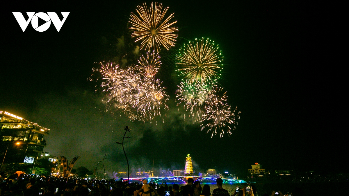 Những chùm pháo hoa rực rỡ được bắn lên từ cầu Vàng. |