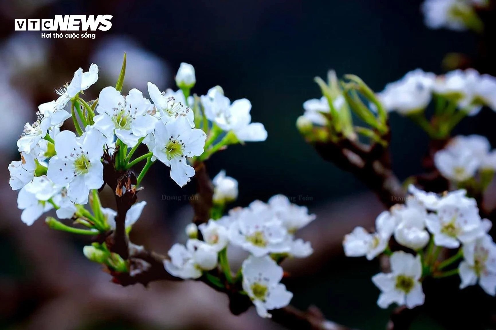 Những cành lê nở hoa trắng như tuyết làm bừng sáng cả khu rừng rộng lớn. |
