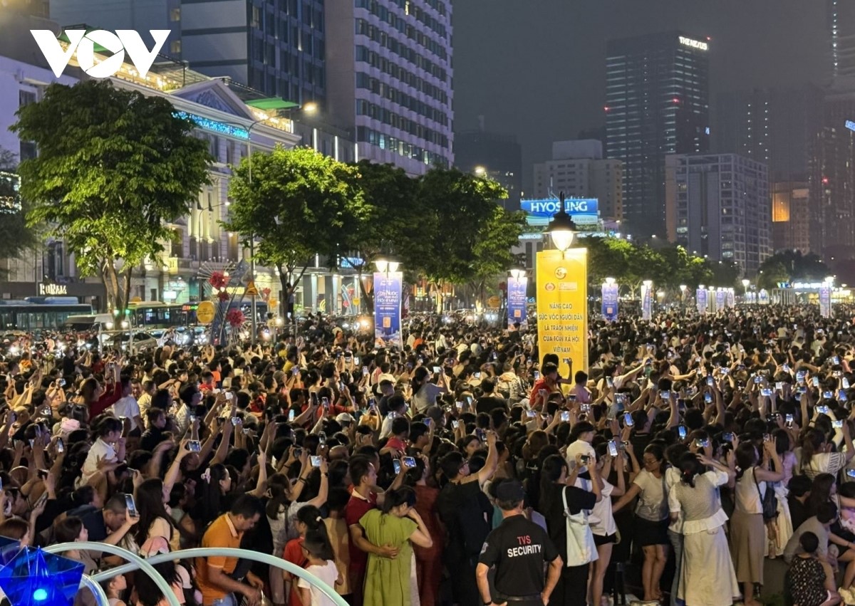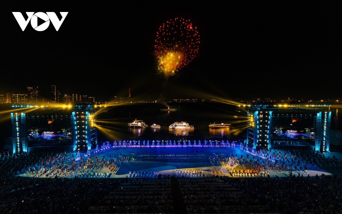 Đúng 20 giờ 30 phút, màn trình diễn bắt đầu và kéo dài khoảng 15 phút trên dòng sông Sài Gòn (đoạn công viên bờ sông thành phố Thủ Đức). Ảnh: Tỷ Huỳnh/VOV |