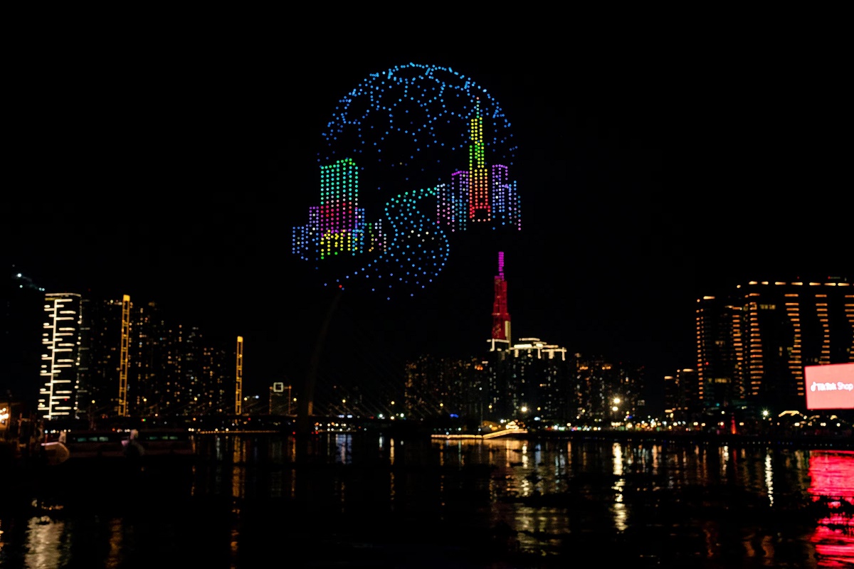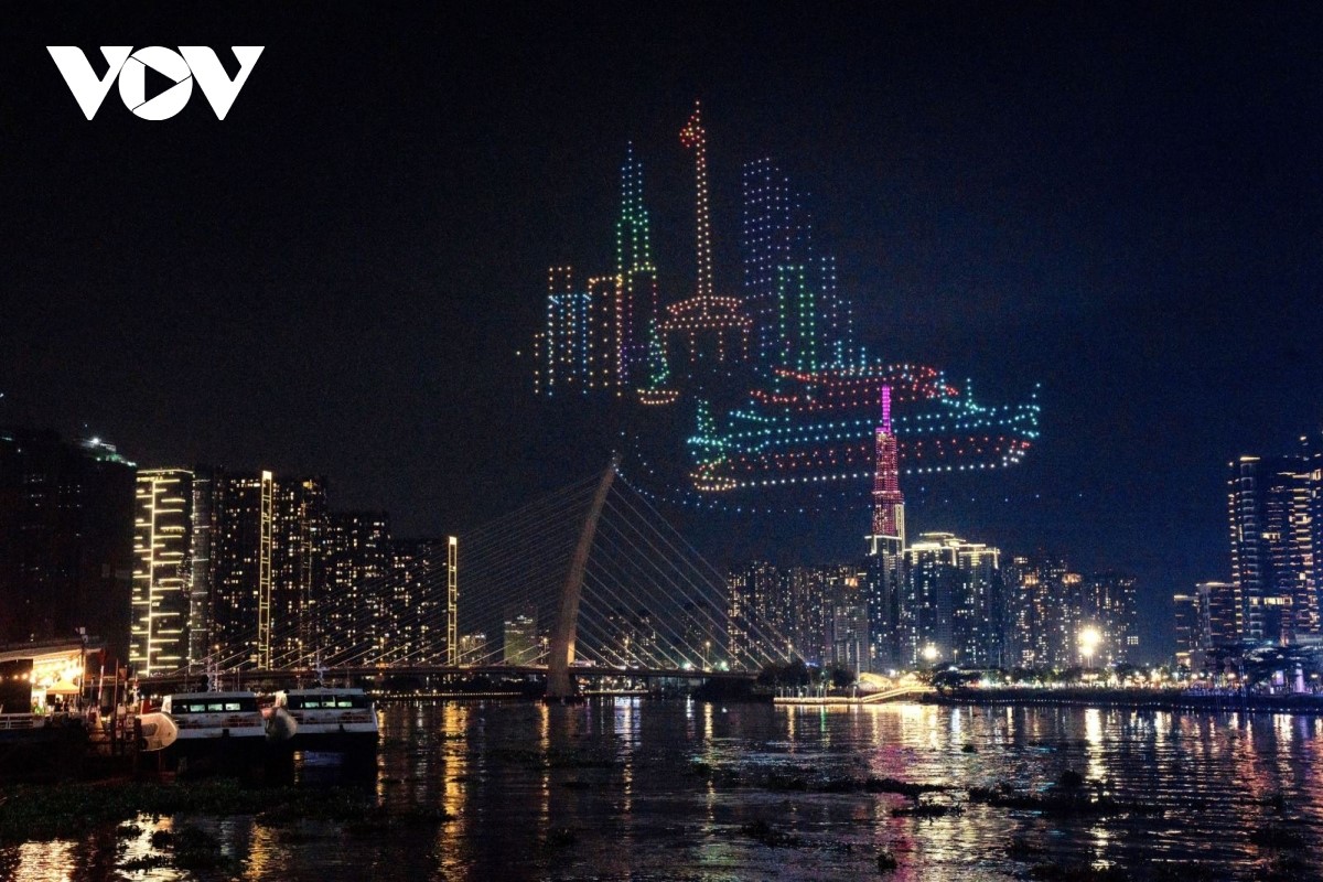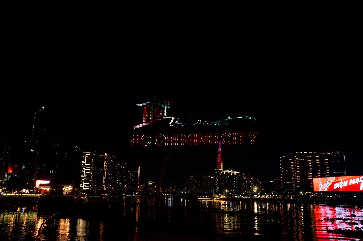 Màn trình diễn nghệ thuật tạo hình trên không bằng thiết bị bay không người lái (drone) mang đến cho người dân và du khách sự thích thú, ấn tượng. Ảnh: Bình An/Sở Du lịch TP. Hồ Chí Minh |