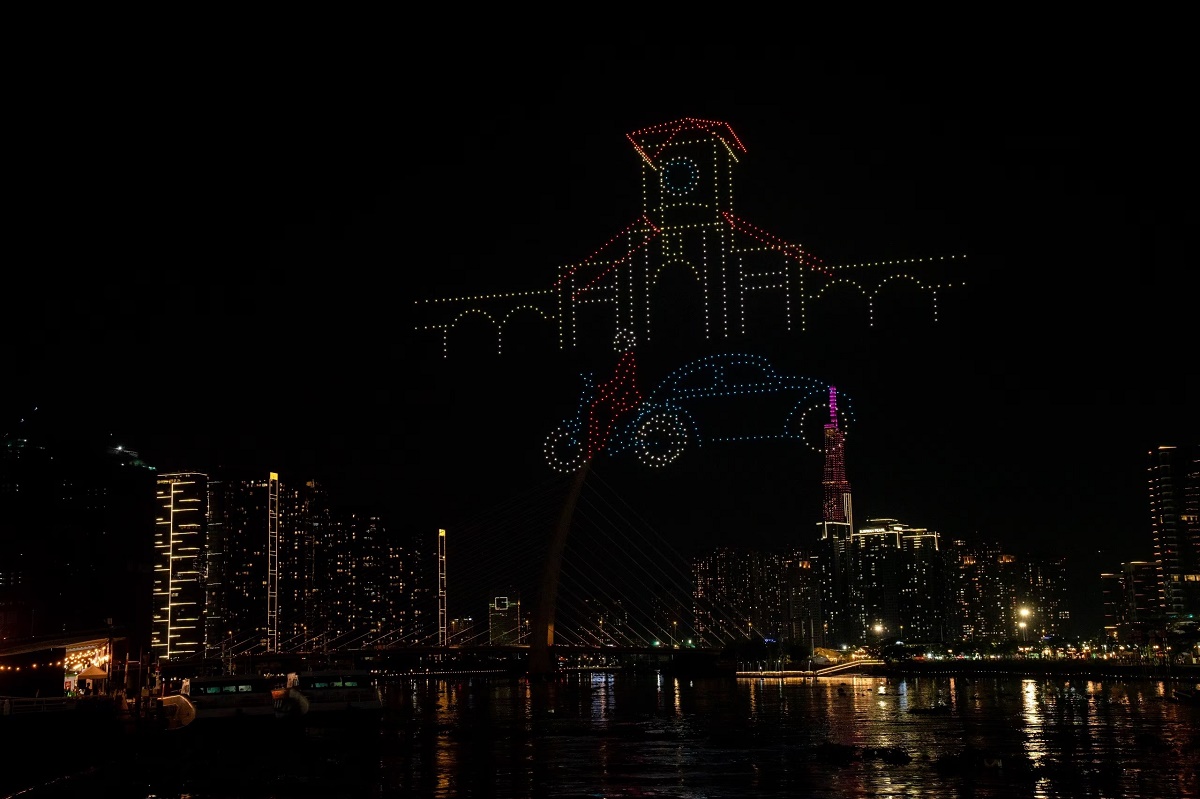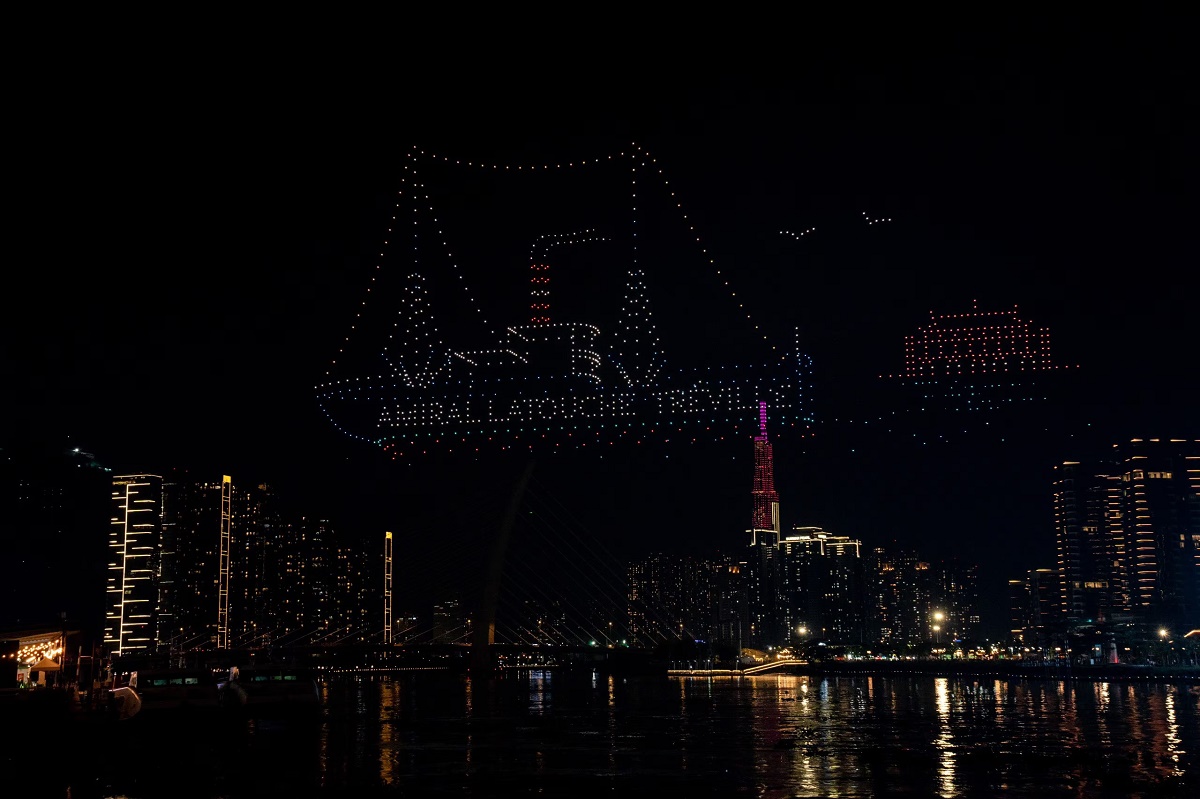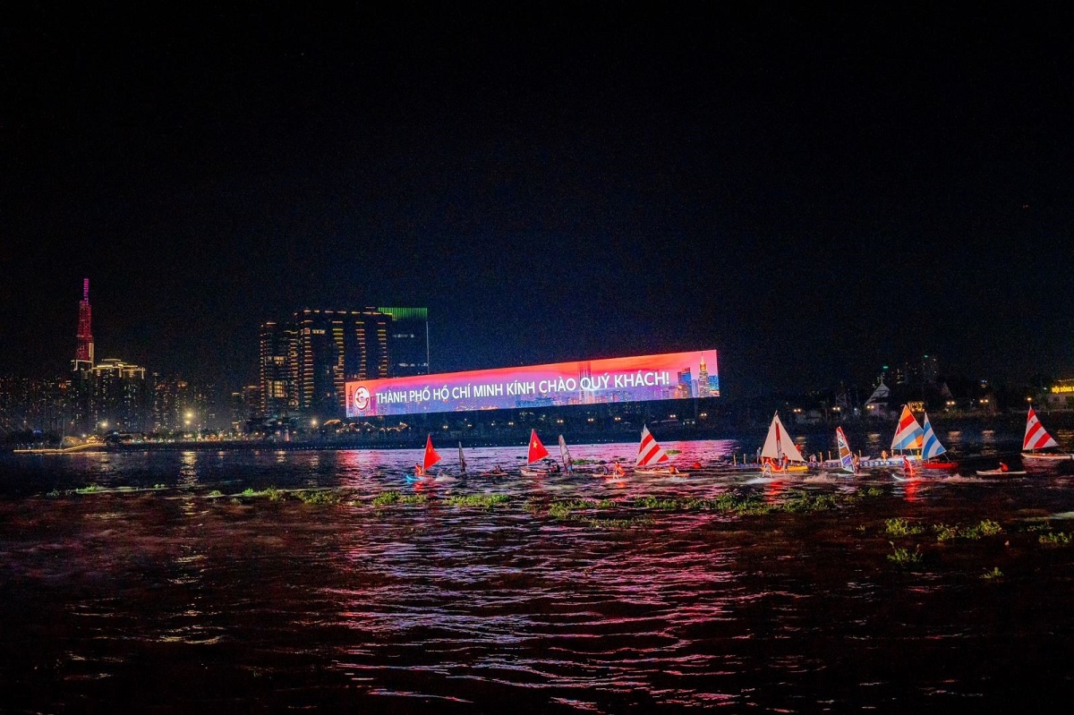 Với chủ đề “TP. Hồ Chí Minh – Lung Linh Dòng sông hát”, 1.100 thiết bị bay không người lái đã vẽ lên bầu trời thành phố những bức tranh đa sắc màu và đầy ý nghĩa hoà cùng không khí sôi động của các hoạt động thể thao dưới nước và diễu hành tàu trên sông Sài Gòn. Ảnh: Bình An/Sở Du lịch TP. Hồ Chí Minh |