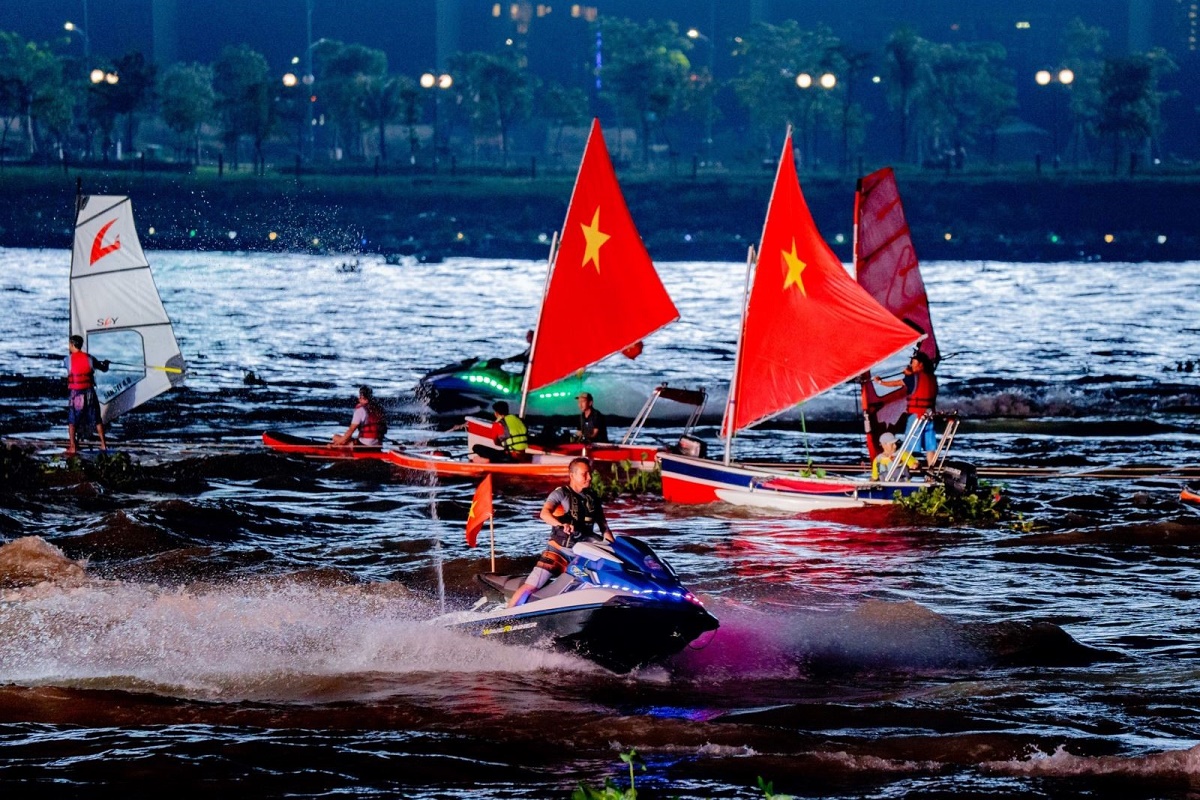Ngoài trình diễn drone nghệ thuật, ban tổ chức cũng kết hợp trình diễn các môn thể thao dưới nước và ánh sáng nghệ thuật với 100 vận động viên biểu diễn 100 phương tiện thể thao: 7 thuyền buồm sailing, 20 mô tô nước, 30 chèo sub, 20 ván phản lực, 5 fly board, 10 thuyền ván diều, 5 dù lượn. Ảnh: Tỷ Huỳnh/VOV |