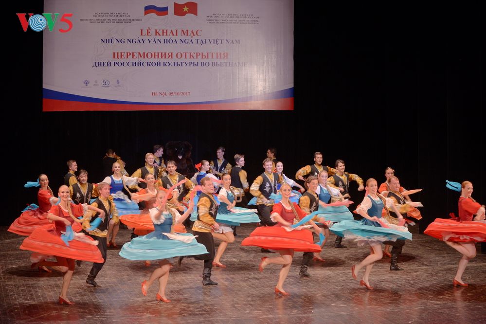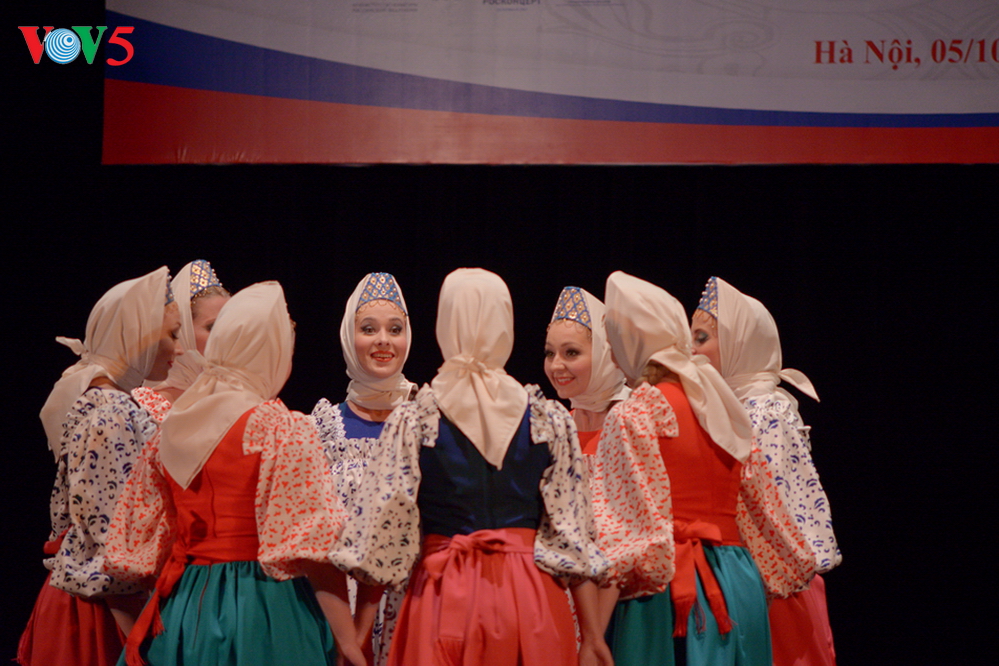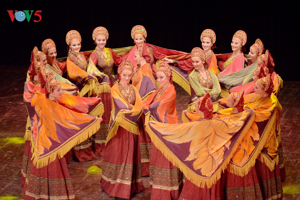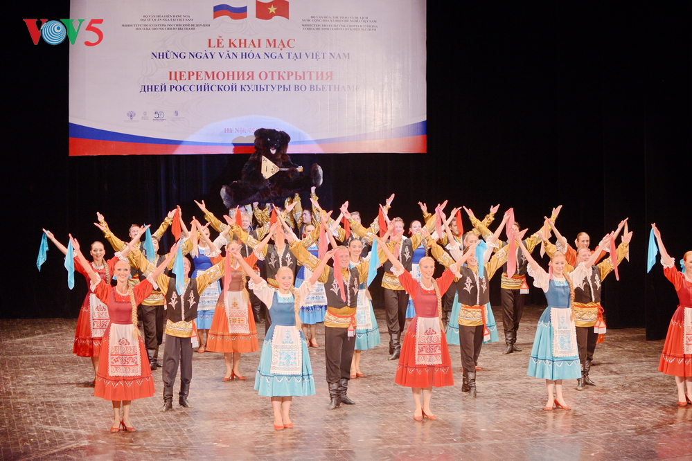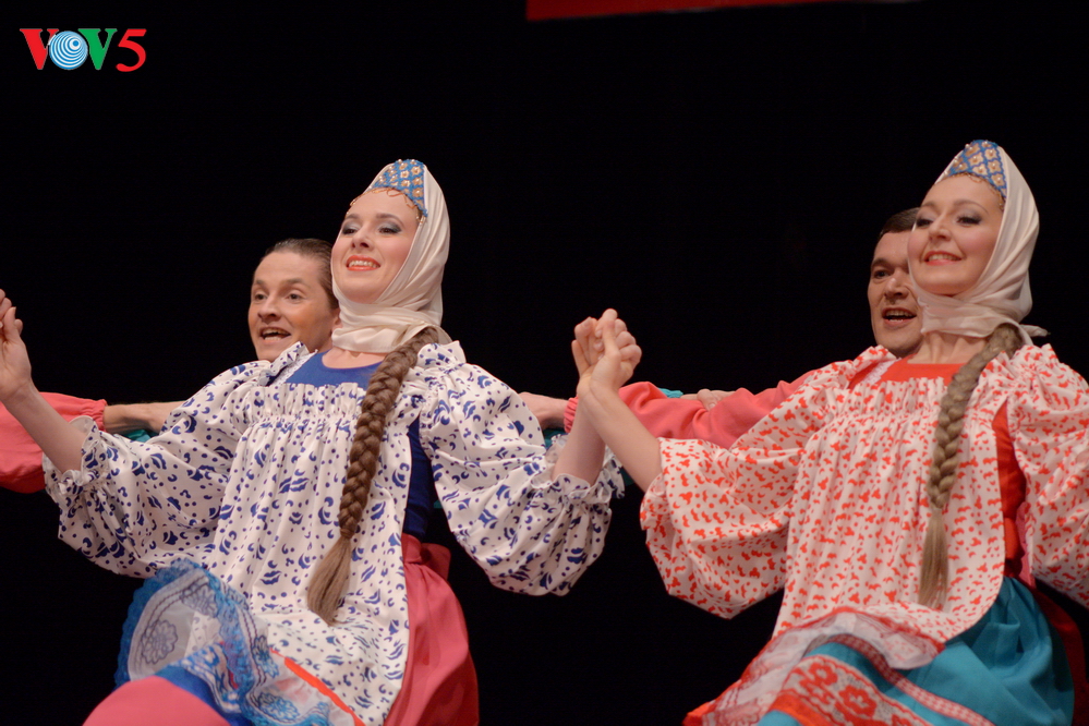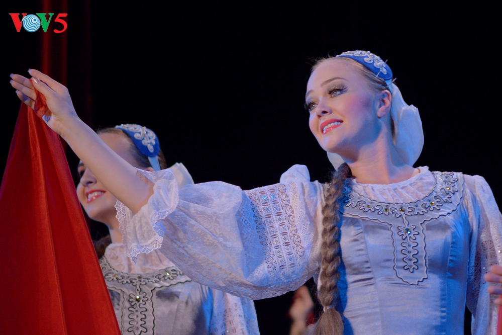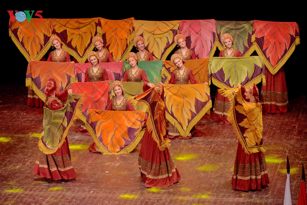 | Ngay sau Lễ khai mạc, khán giả được thưởng thức một chương trình biểu diễn nghệ thuật đặc sắc của Dàn đồng ca Quốc gia Nga “Bạch Dương”, với những điệu múa truyền thống như: Múa vòng tròn, Múa vui, Những anh chàng vui tính, Vũ khúc mùa thu, Các bác xà ích, Múa vòng tròn miền Bắc Nga, Múa khăn quàng, Tổ khúc Siberia. |