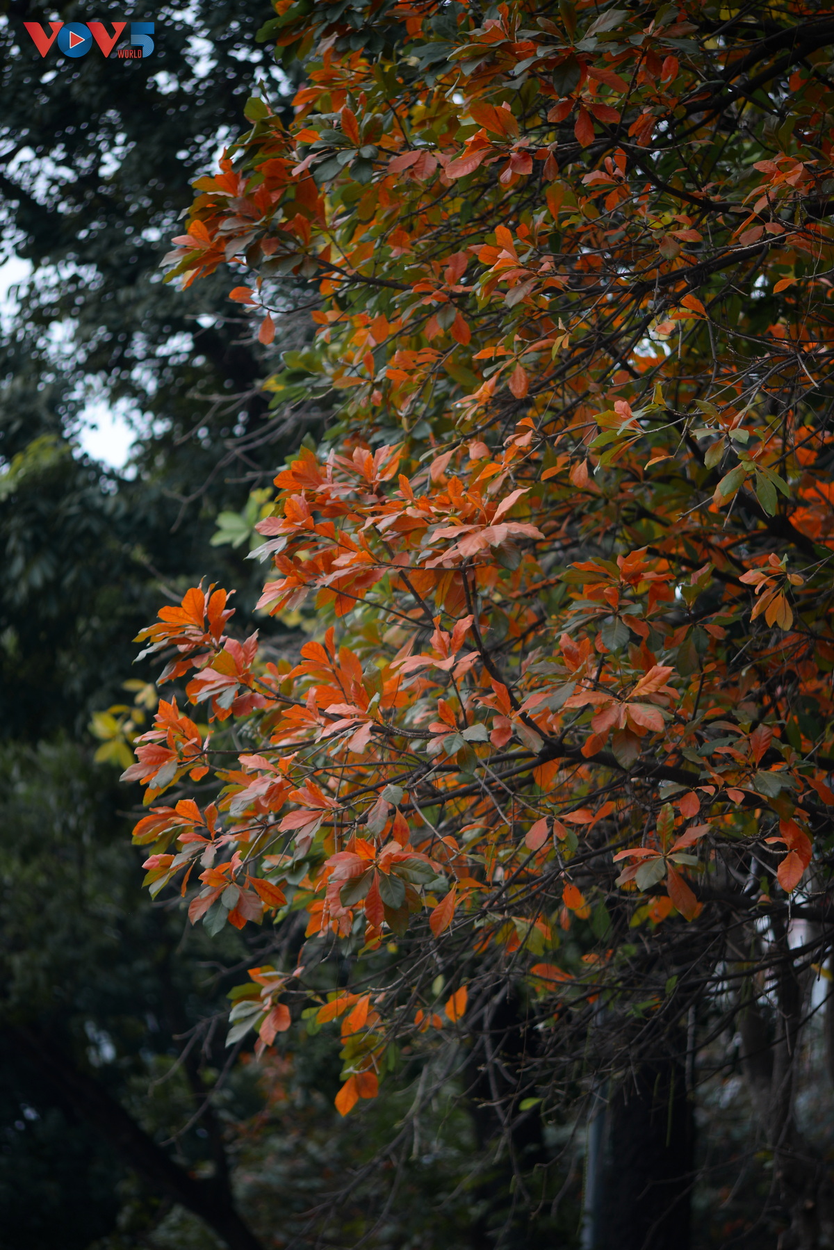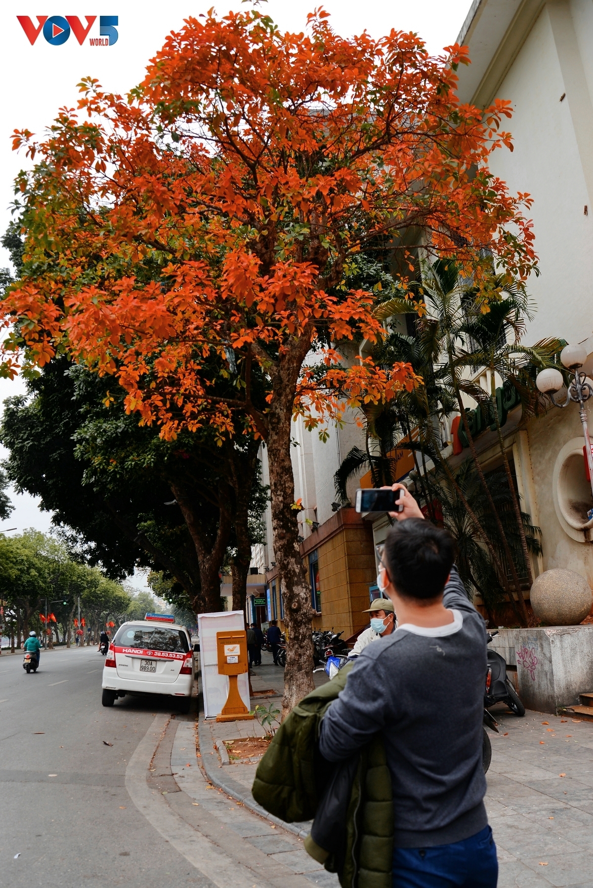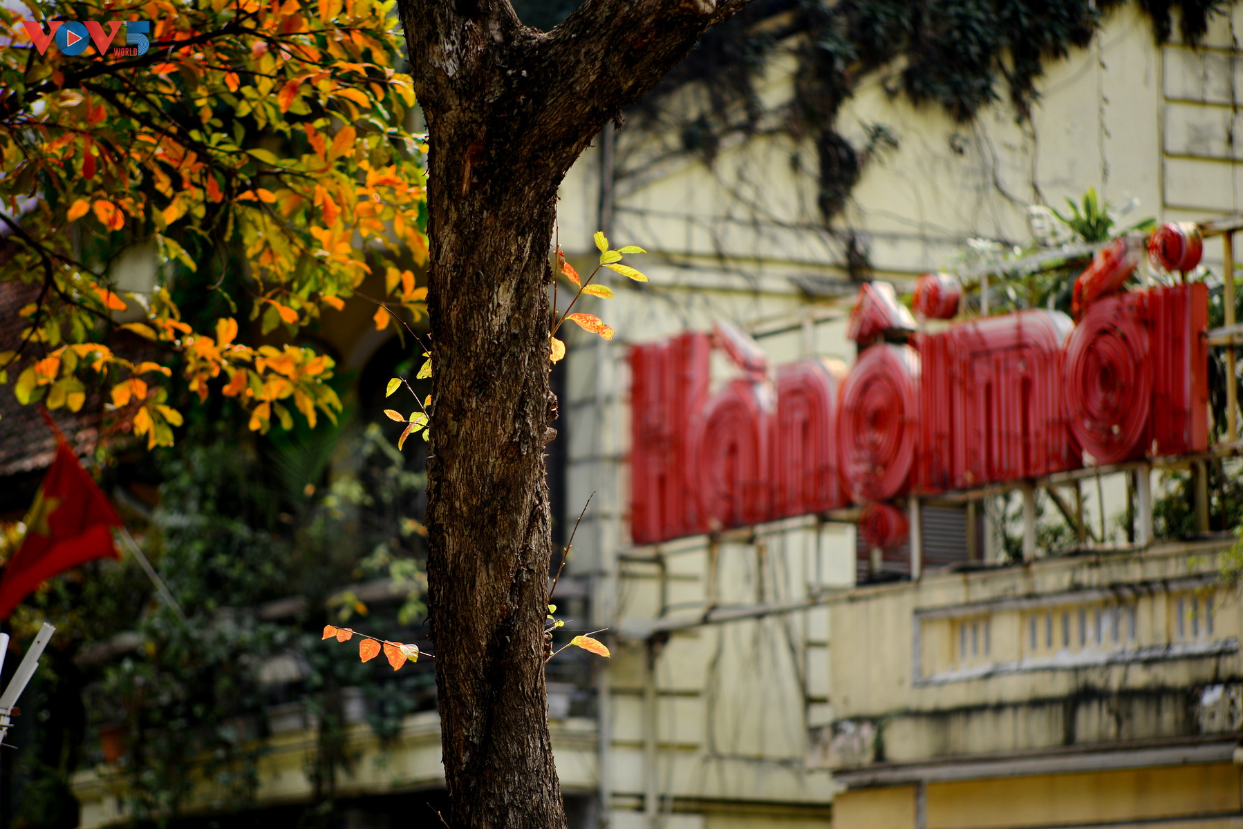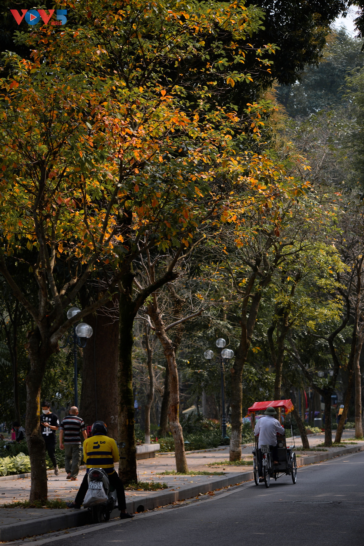 | Những ngày này, khi đi qua những con phố bên Hồ Gươm, có thể dễ dàng bắt gặp những hàng cây thay lá, sắc vàng, đỏ nổi bật cả một góc đường. |