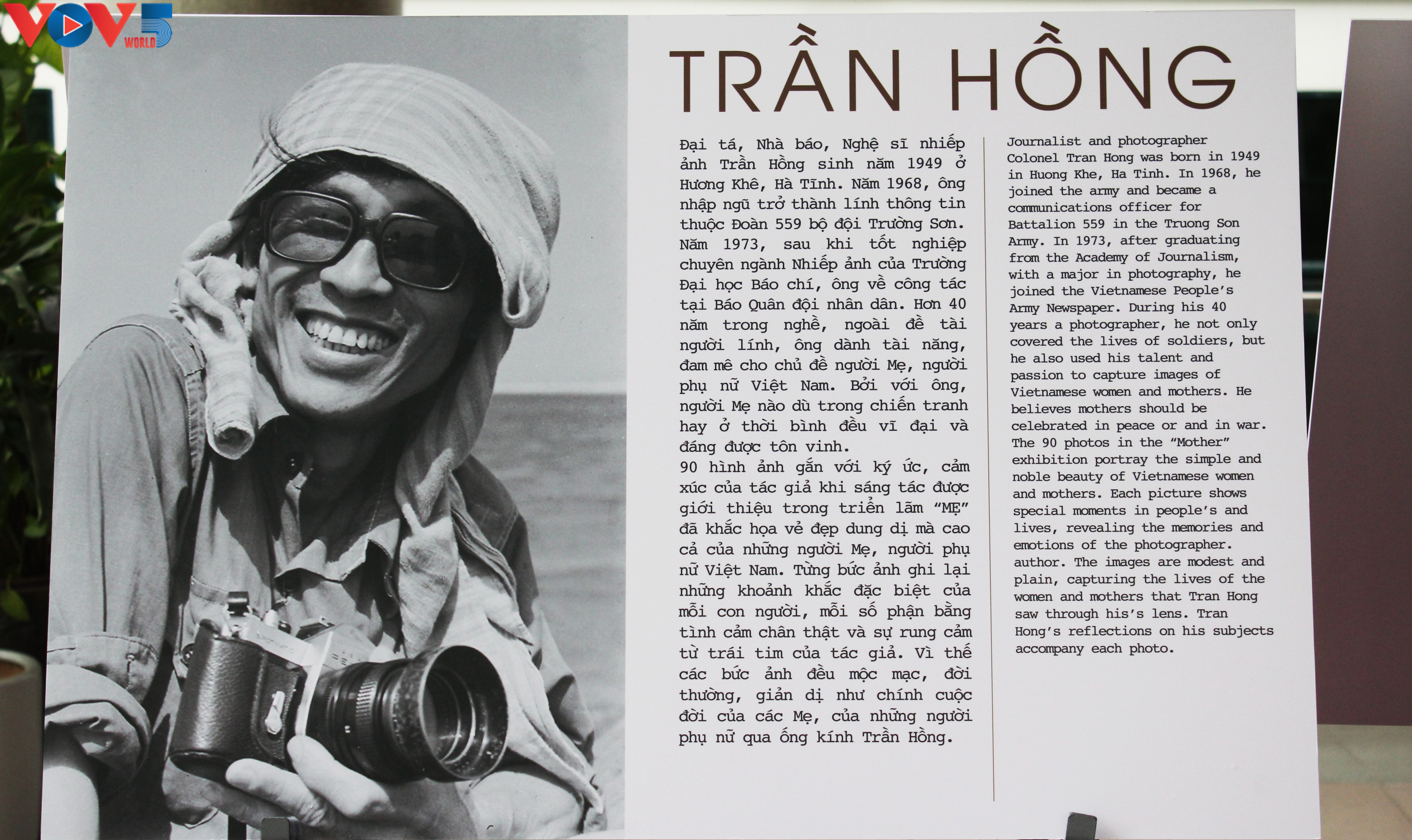 Đại tá, NSNA Trần Hồng từng là một người lính bước ra từ chiến trường. Ngay từ khi vào nghề, ông đã viết và chụp ảnh về các bà mẹ. Trong “gia tài” nghề nghiệp của mình, đại tá Trần Hồng có rất nhiều bức ảnh về đề tài này. “Tiêu đề của Triển lãm - “Mẹ” chính là mẫu số chung giúp tôi lột tả những mảnh ghép đa sắc về các Mẹ, tạo nên bức chân dung về người phụ nữ Việt Nam với đầy sự tự hào và tình yêu thương. Chân dung của các Mẹ tại triển lãm này đã nói lên tất cả những điều đó. Chúng ta hãy đến với những tác phẩm như đến với những giọt sữa, lời ru, đến với chiếc nôi và cánh võng của Mẹ”, đại tá Trần Hồng xúc động.