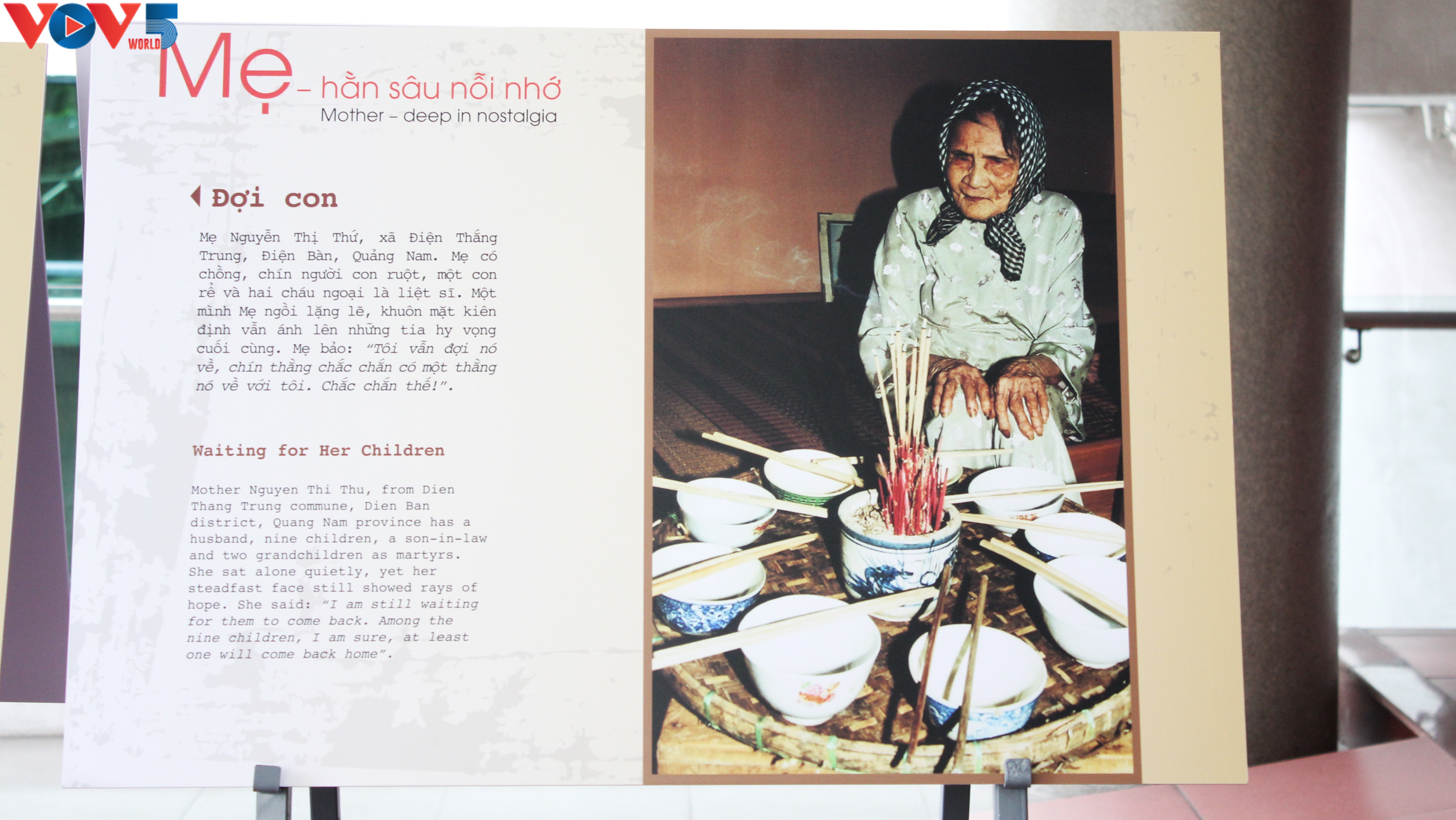 Gây xúc động mạnh là hình ảnh mẹ Thứ, xã Điện Thắng Trung, huyện Điện Bàn, tỉnh Quảng Nam với mâm cơm cúng có 9 đôi bát đũa dành cho 9 người con liệt sĩ. Nỗi đau của Mẹ đã được Tổ quốc tạc thành tượng đài. Mẹ có chồng, chín người con ruột, một con rể và hai cháu ngoại là liệt sĩ. Hình ảnh NSNA Trần Hồng chụp Mẹ ngồi lặng lẽ, khuôn mặt kiên định và vẫn ánh lên những tia hy vọng cuối cùng. Mẹ bảo: “Tôi vẫn đợi nó về, chín thằng chắc chắn có một thằng nó về với tôi. Chắc chắn thế!”.