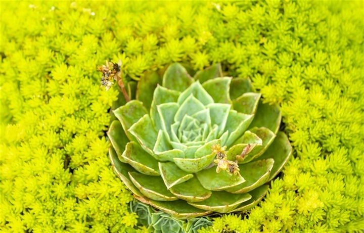 Bao quanh thảm hoa dơn lúa rực rỡ sắc màu là những đóa sen đá xanh bình dị, thuần khiết. Sen đá vốn là loài hoa đỏng đảnh, chỉ thích hợp ở xứ hoa Đà Lạt. Thế nhưng khi về Fansipan khắc nghiệt, hoa lại có sức sống mãnh liệt đến diệu kỳ. Hoa sinh trưởng nhanh, bền bỉ hơn so với khi ở quê mẹ Đà Lạt. Ở Fansipan chủ yếu trồng nhiều sen đá thanh ngọc và sen đá Phật bà.