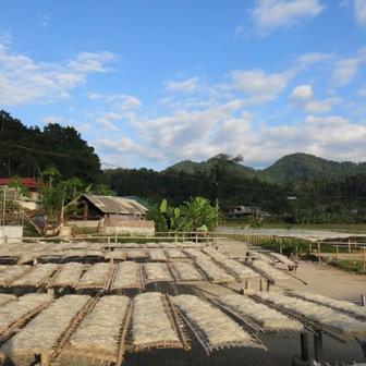 | Miến được phơi khô trên những phiên tre, đợi mang vào đóng gói |
