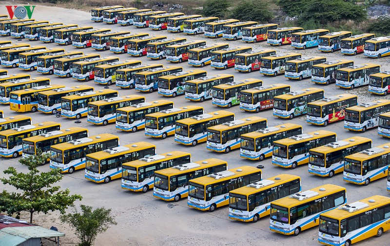 Thực hiện chủ trương ngưng phục vụ trong thời điểm dịch Covid-19 diễn biến phức tạp, xe buýt Quảng An 1 chạy tuyến nội thành đành tập kết tại bãi xe của mình.