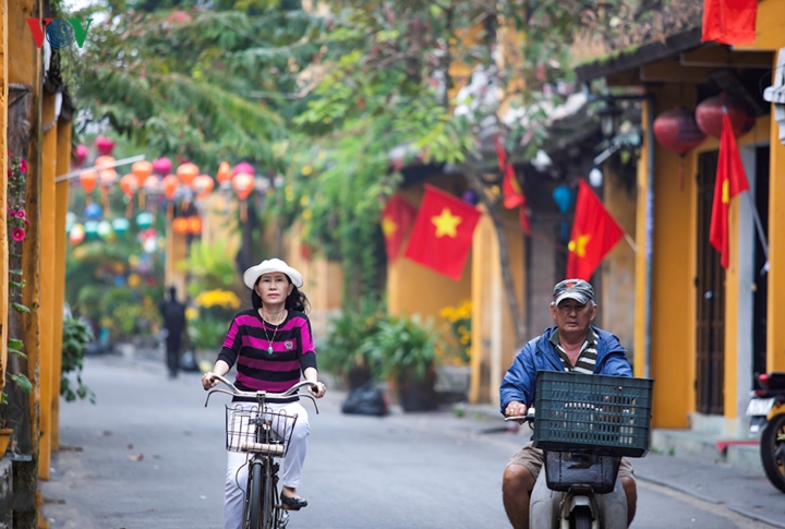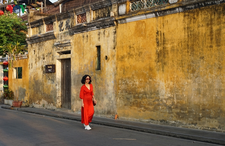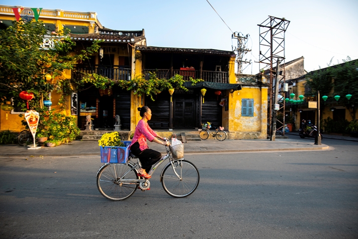 Khi nắng bắt đầu vươn lên trên những mái nhà là lúc Hội An tỉnh giấc sau một đêm dài. Rất dễ bắt gặp hình ảnh những vị khách "lang thang" trên phố. |