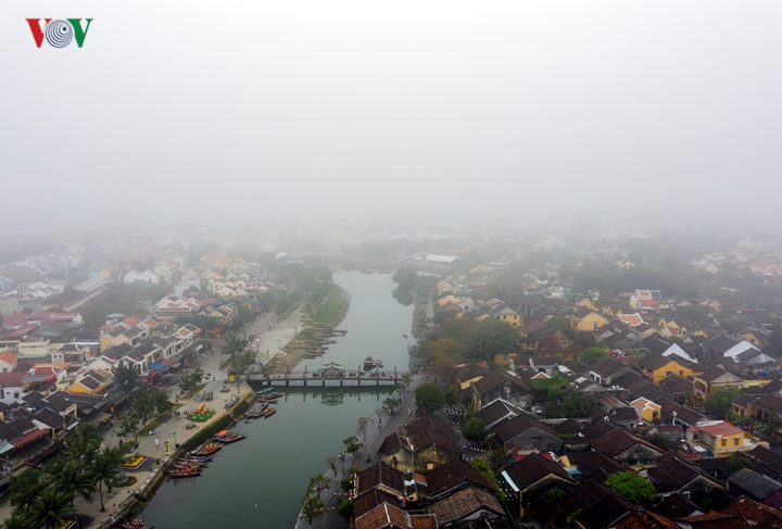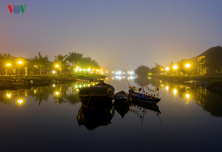 Khi mặt trời chưa nhô ở phía chân trời, những mái ngói rêu phong huyền ảo, Hội An như thiếu nữ ngủ say dưới tấm khoác hoài cổ thật quyến rũ. Trong ảnh: Tờ mờ sáng, một màn sương bao phủ trên sông Hoài (ảnh Thanh Chương). |