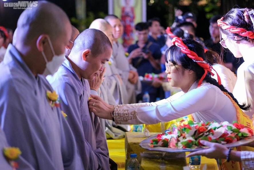 Những người tham dự buổi lễ Vu Lan báo hiếu đều chọn cho mình một bông hoa tương ứng và cài lên ngực. Ảnh: VTC |