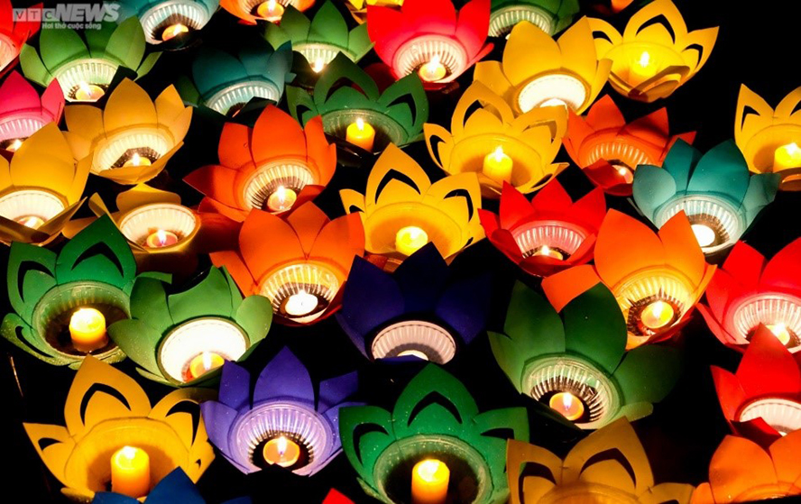 Người theo đạo Phật tin rằng những ngọn nến là biểu tượng cho trí tuệ, ánh sáng chân lý, phá tan màn vô minh, u ám. Hàng nghìn bông hoa đăng đã được người dân thả xuống dòng suối êm đềm như những lời cầu nguyện cho thế giới hòa bình, nhân dân hạnh phúc, an lạc. Ảnh: VTC |