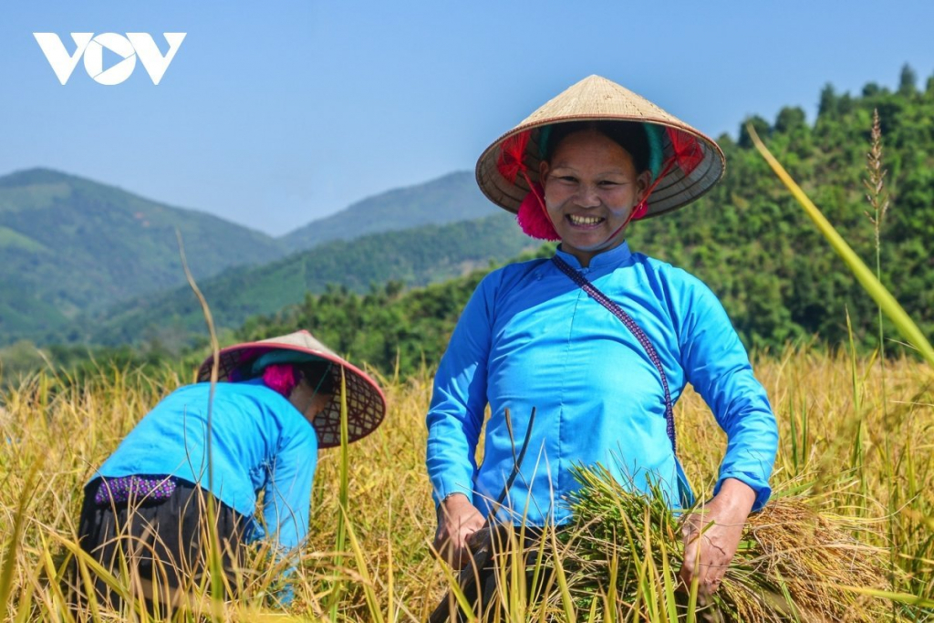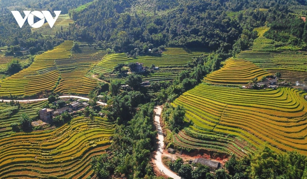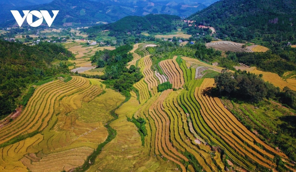 | Xen giữa sóng lúa vàng ở thôn Ngàn Pạt, Cao Thắng, Khe O, những bản làng của người Dao, người Sán Chỉ mái ngói rêu phong dưới nắng chiều. |