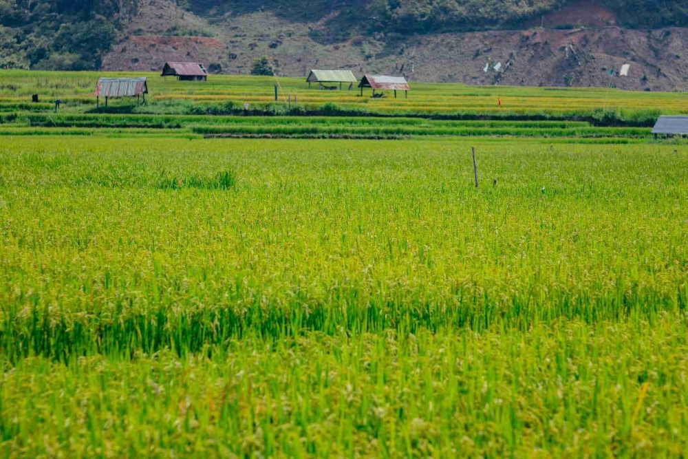 Từ cuối tháng 5, những thửa ruộng bậc thang ở làng Kon Tu Rằng, huyện Kon Plông (tỉnh Kon Tum) chuyển màu, tạo nên bức tranh vàng rực rỡ. Ảnh: FB Hi Măng Đen