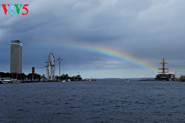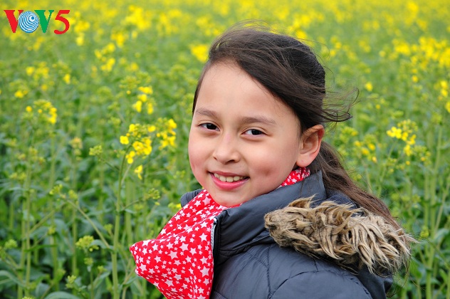 Cô bé mang hai dòng máu Việt Nam - Đức đùa nghịch bên cánh đồng hoa cải đang trổ bông. |