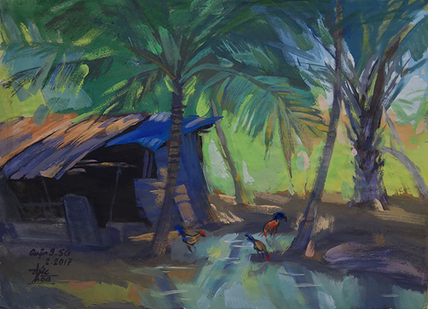 Vườn dừa quận 9- SG, bột màu/giấy báo, kích thước 41 x 56cm.