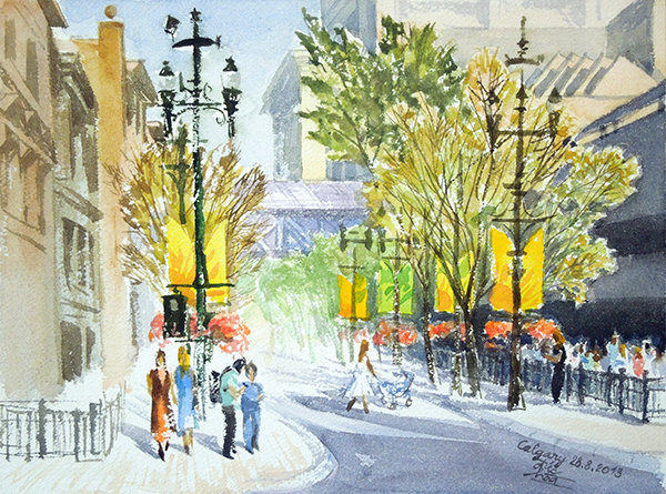 Nắng chiều trên phố Calgary, màu nước/giấy Arches, kích thước 22,5 x 30,5cm.