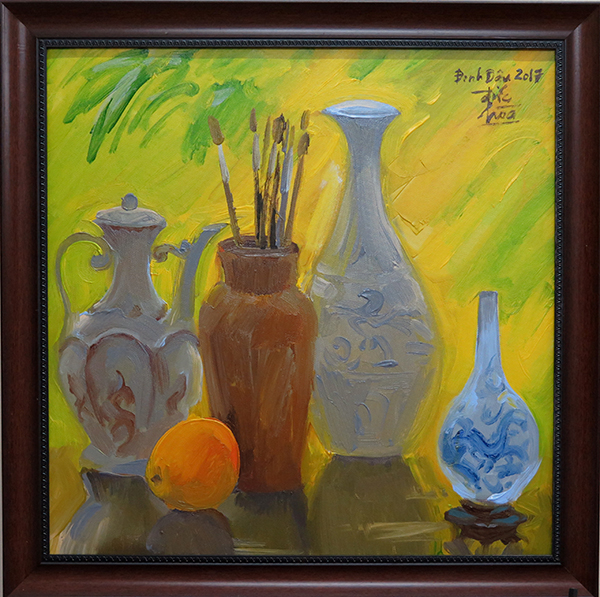4 chiếc lọ cổ và quả táo, acrylic/toan, kích thước 50 x 50cm.