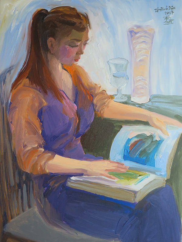 Cô gái đọc sách, acrylic/toan, kích thước 80 x 60cm.