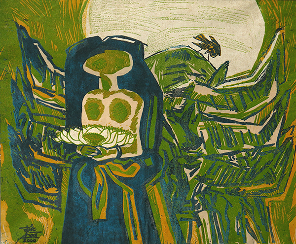 Cô gái và đàn trâu, khắc gỗ màu in trên giấy dó, kích thước 40 x 50cm.