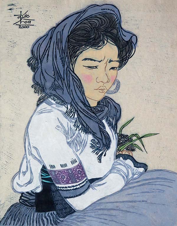 Cô gái H'Mong nhăn mặt, khắc gỗ màu in trên giấy dó, kích thước 36 x 28,5cm.