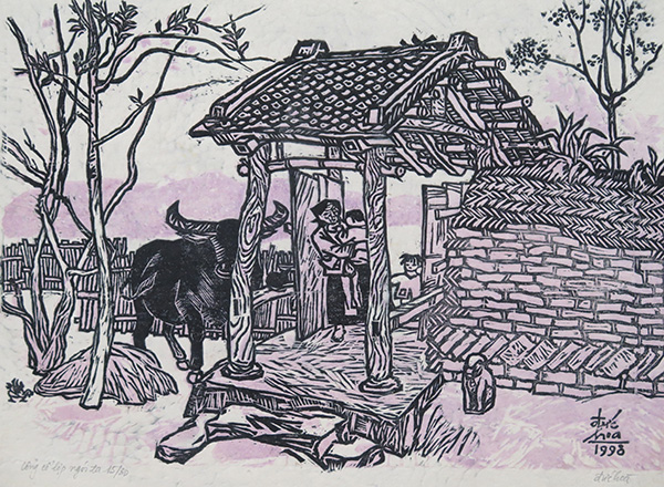 Cổng cổ lợp ngói ta, khắc gỗ màu in trên giấy dó, kích thước 25 x 34cm.