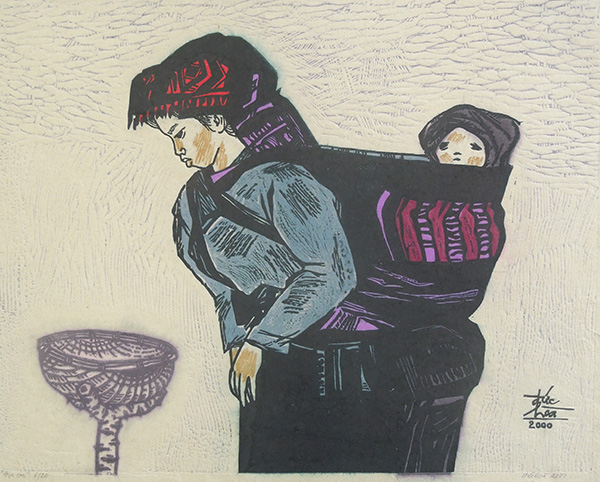 Địu con, khắc gỗ màu in trên giấy dó, kích thước 39 x49cm.