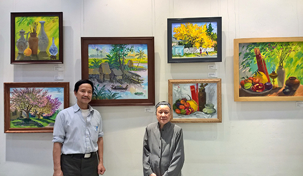Họa sĩ Nguyễn Đức Hòa (trái) và bà Nghiêm Thúy Băng, vợ nhạc sĩ Văn Cao tại triển lãm Mùa xuân tại Hà Nội.