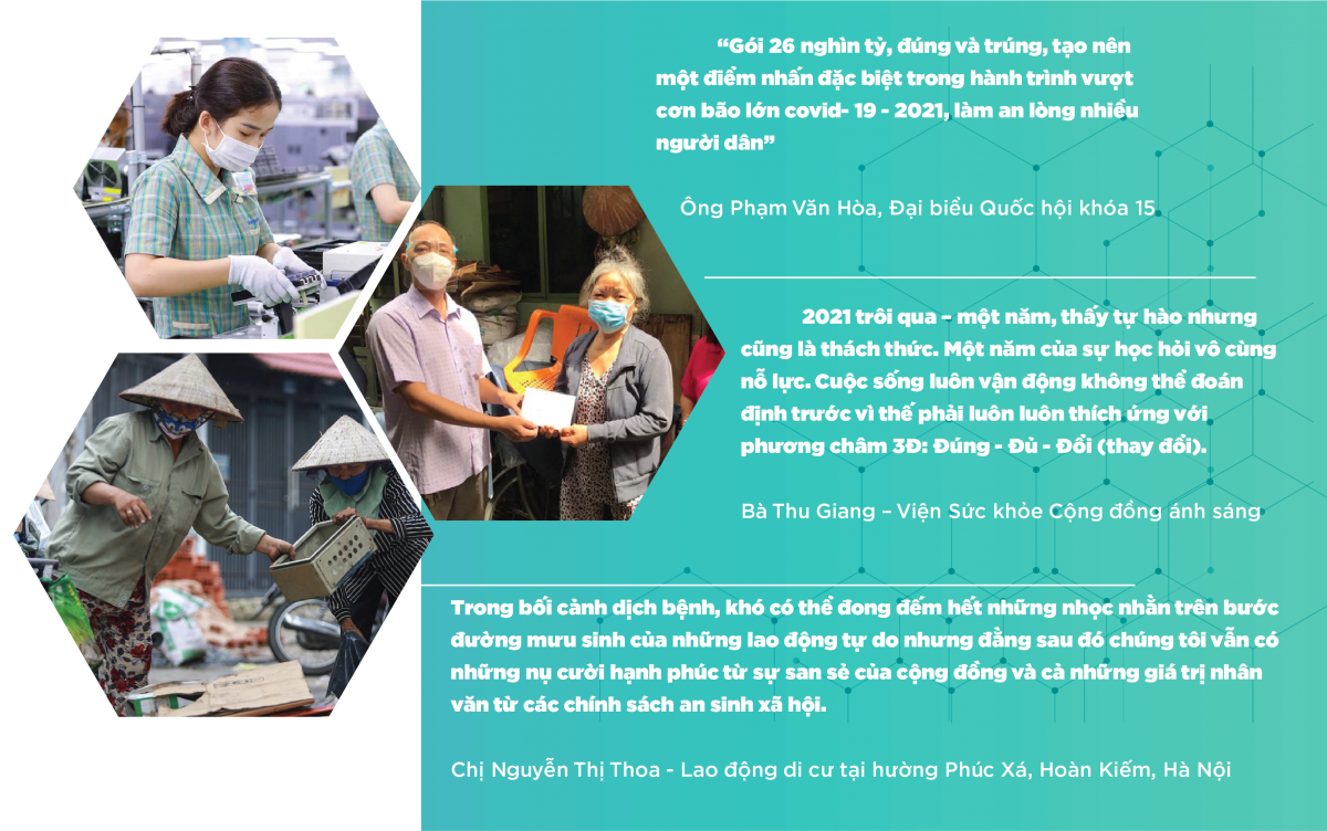 Một năm không chỉ đáng nhớ với những câu chuyện của tình người và sự tử tế, mà còn là năm ghi nhận rất nhiều điểm sáng trong bức tranh an sinh xã hội. Với tinh thần "không để ai bị bỏ lại phía sau", ngay khi dịch bệnh bùng phát, chỉ trong thời gian ngắn, Chính phủ đã ban hành các gói hỗ trợ về an sinh xã hội như gói 26 nghìn tỷ theo Nghị quyết 68, gói 38 nghìn tỷ theo Nghị quyết 116…Đây được xem là các quyết sách quan trọng, chưa từng có tiền lệ, kịp thời bổ sung, gia tăng năng lực hoạt động cho hệ thống an sinh xã hội, ứng phó kịp thời và hiệu quả với những tác động mà đại dịch gây ra.