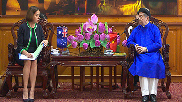 Chủ tịch UBND tỉnh Thừa Thiên Huế Phan Ngọc Thọ mặc áo dài, đội khăn xếp, tiếp đại sứ Australia tại Việt Nam hôm 10-7-2020 - Ảnh: thuathienhue.gov.vn