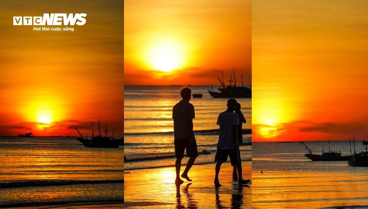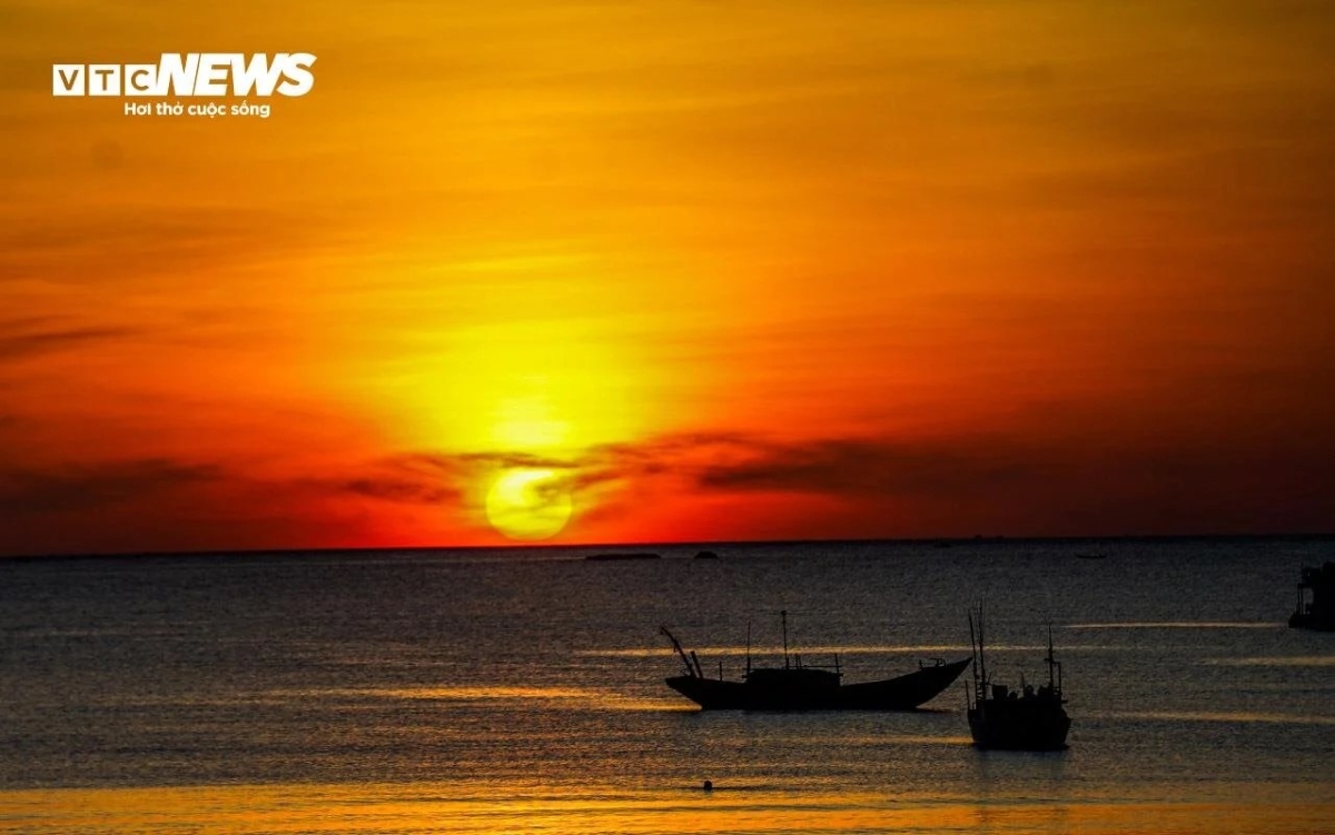 Mặt trời nhô lên vào khoảng 5h30 như hòn lửa khổng lồ. Cả bãi biển được nhuộm bởi một màu đỏ ửng. |