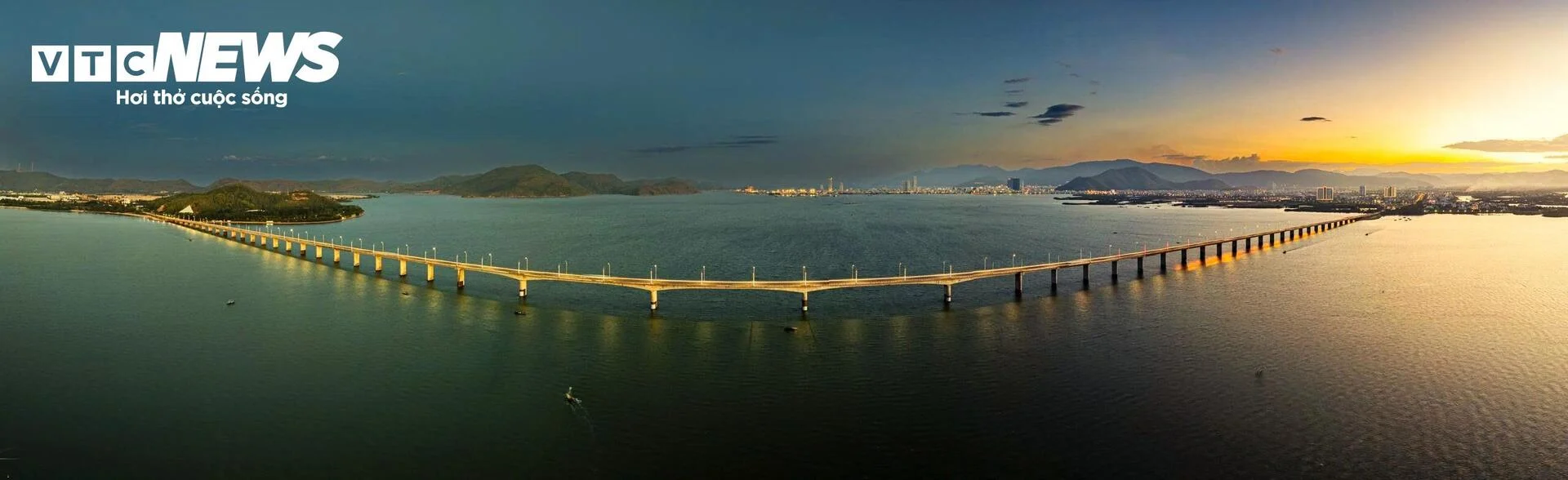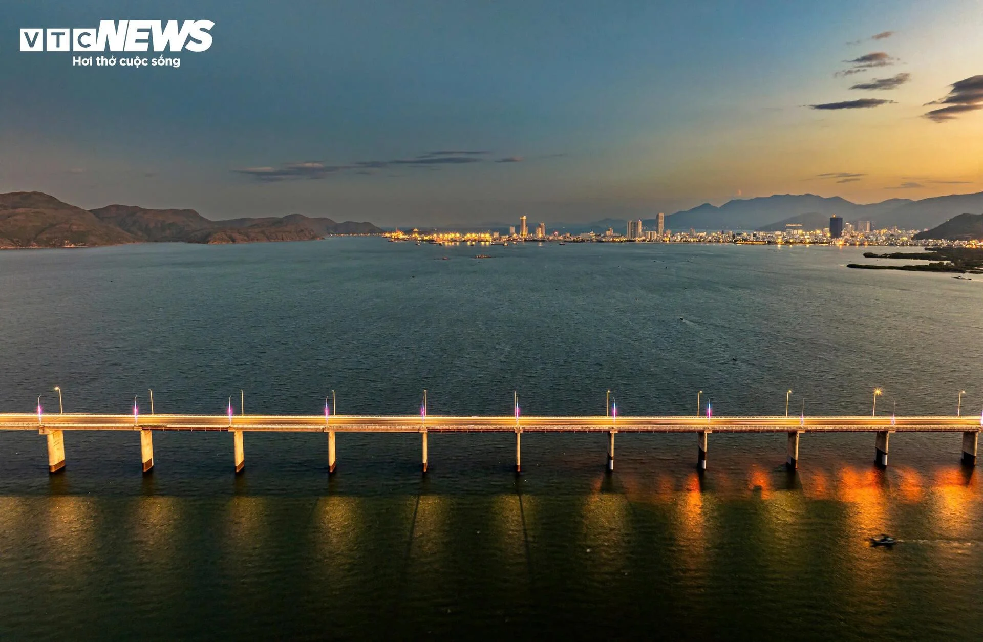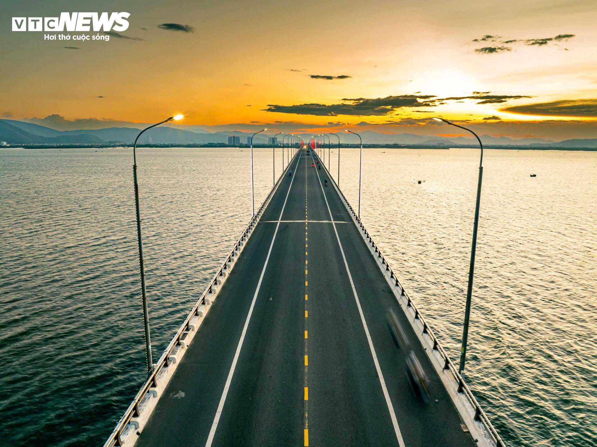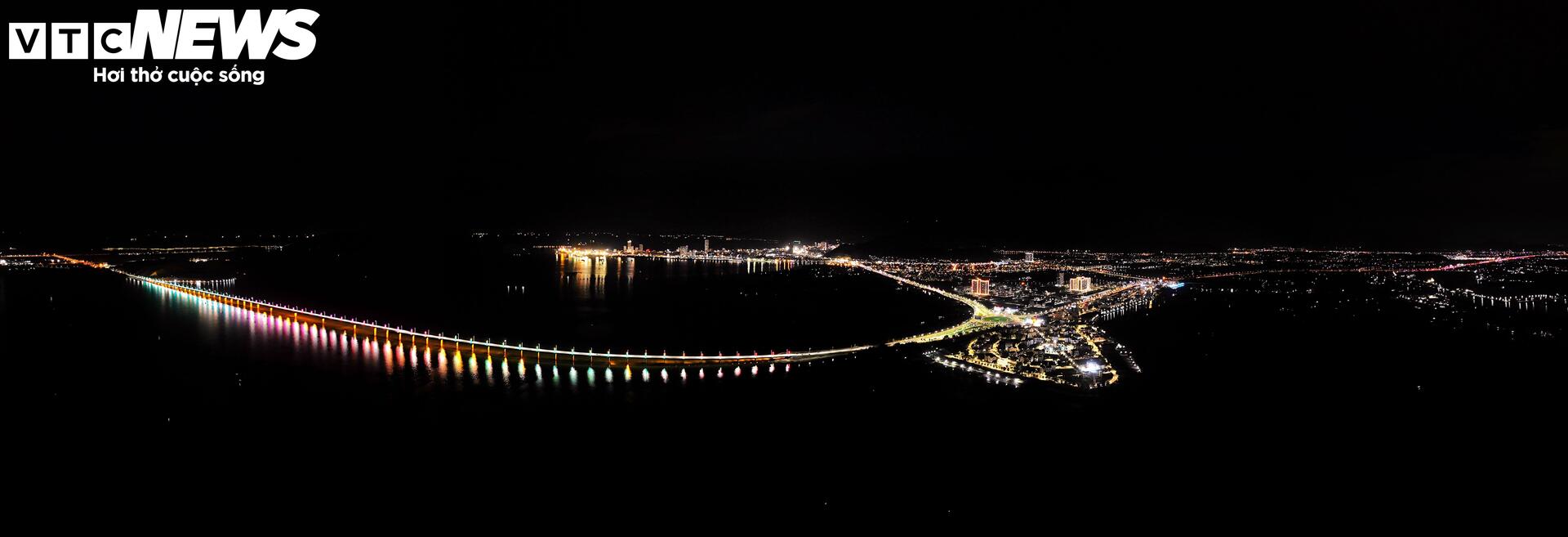 | Khi chiều tà, ánh nắng kết hợp với ánh đèn biến cầu Thị Nại thành một vệt sáng lung linh, huyền ảo, tuyệt mỹ. |