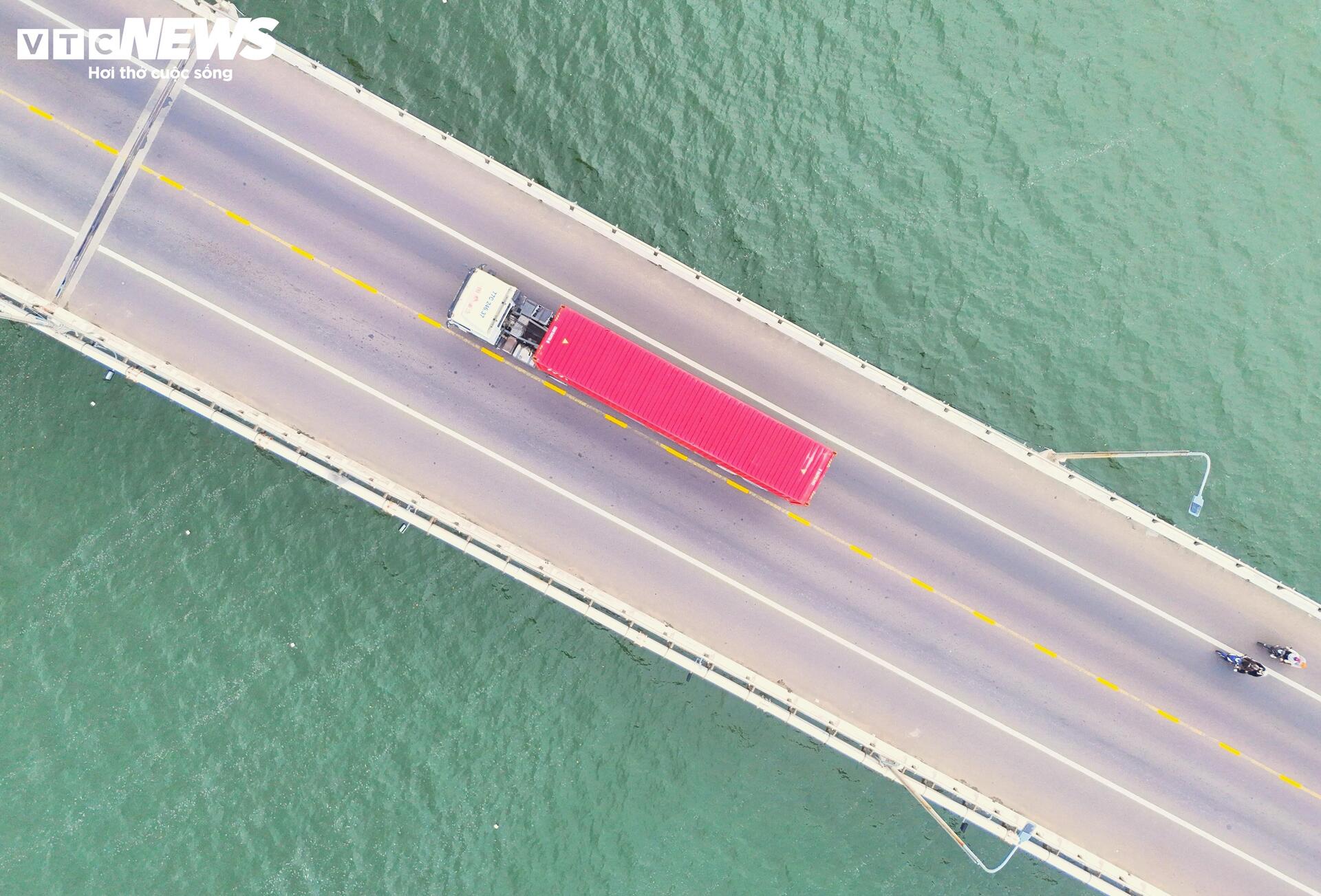 | Nhìn từ xa, cây cầu dài màu trắng vắt qua biển xanh, nối liền một bên là đất liền, một bên là biển đảo tạo nên nổi bật giữa khung cảnh kỳ vĩ, bao la. |