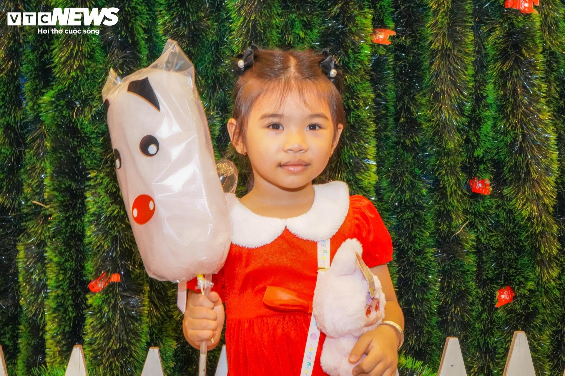 | Các em nhỏ dạo chơi dưới cây thông Noel và vui đùa chụp hình lưu niệm dưới "cơn mưa tuyết" nhân tạo. |