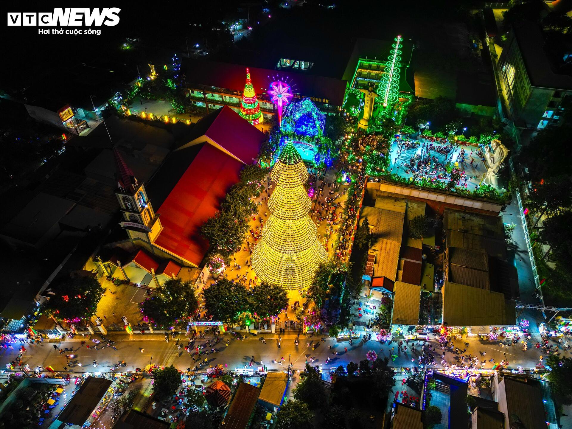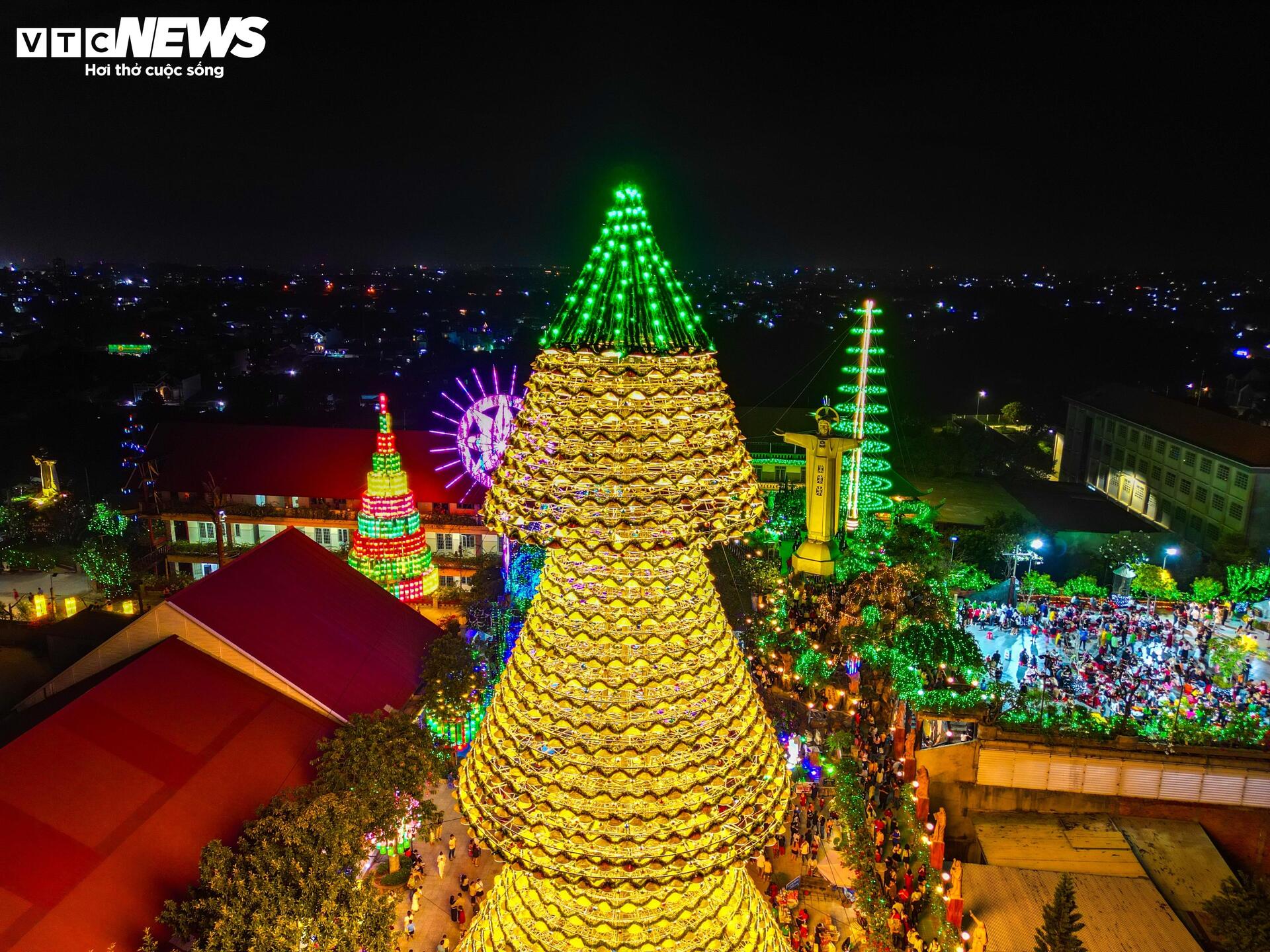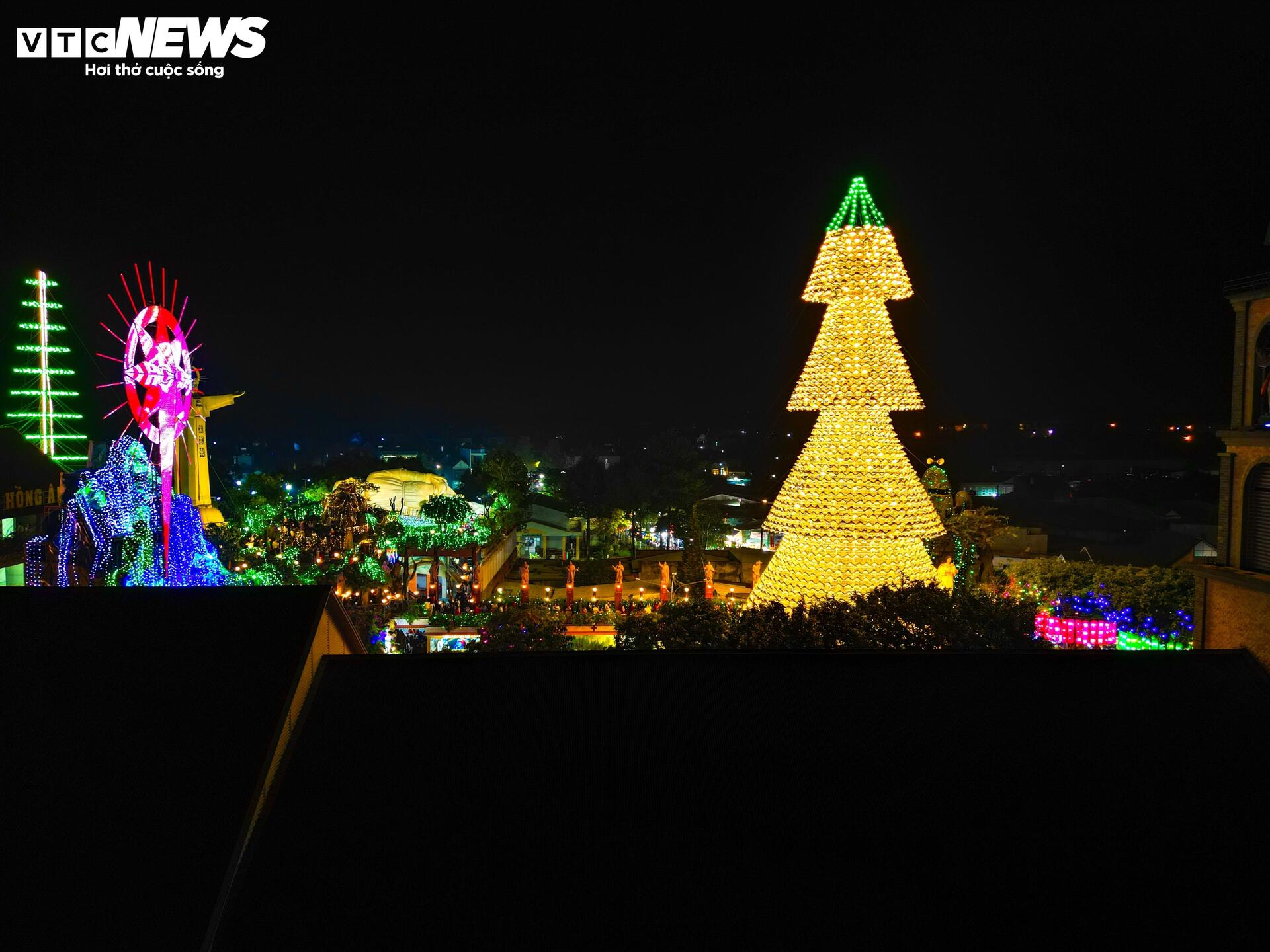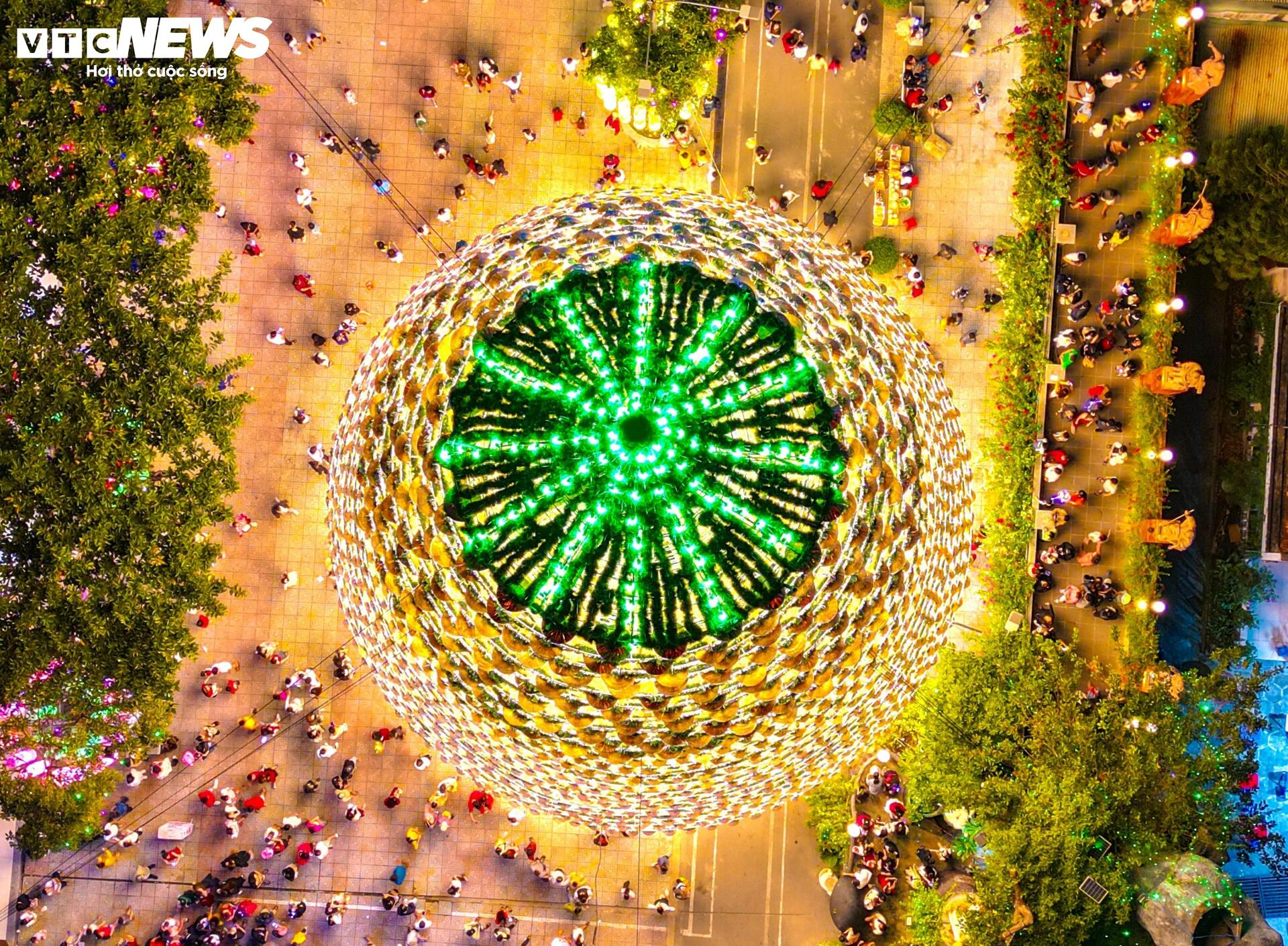 | Nhìn từ trên cao, đỉnh cây thông Noel phát sáng với màu sắc lung linh, huyền ảo. |