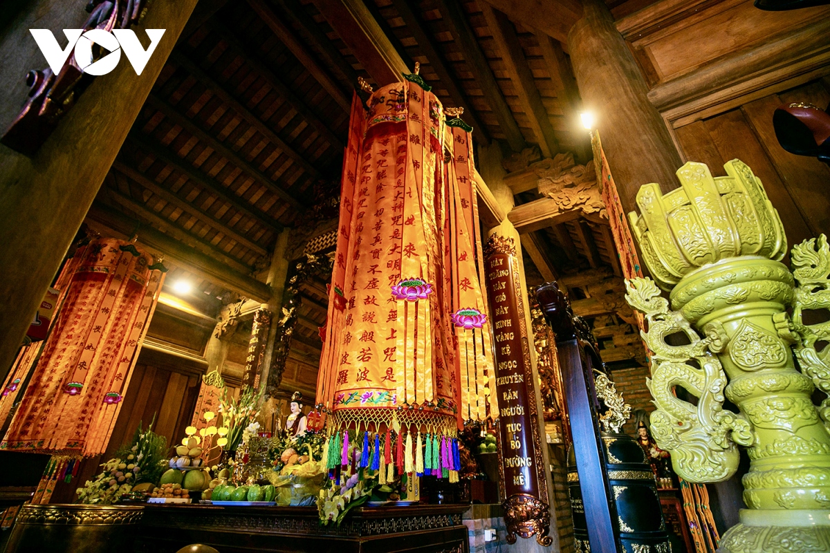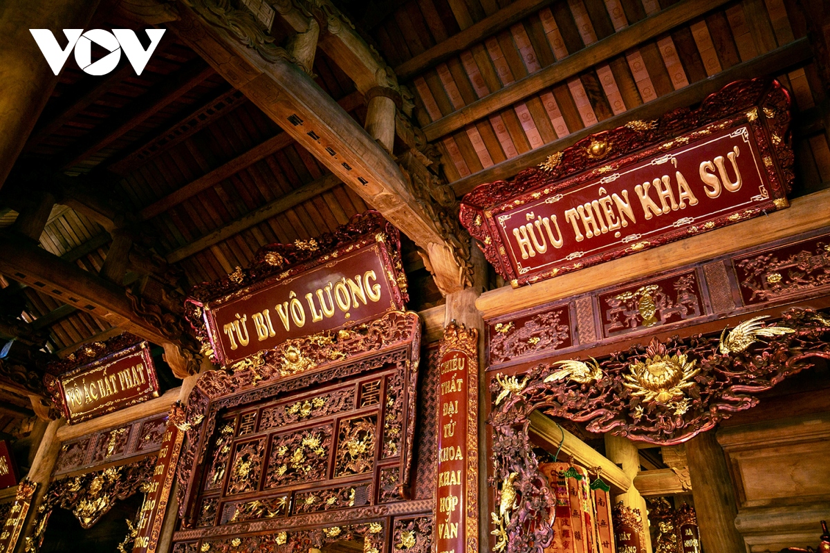 Hệ thống hoành phi, câu đối cửa võng…được chế tác tinh xảo bằng gỗ, sơn son thếp vàng, sử dụng ngôn ngữ thuần Việt dễ đọc, dễ hiểu, khẳng định và giữ gìn bản sắc văn hoá dân tộc. |