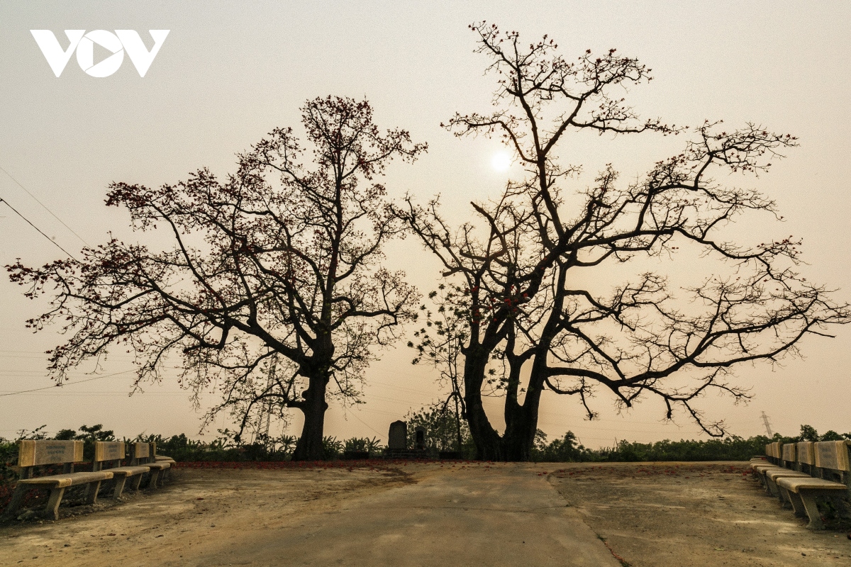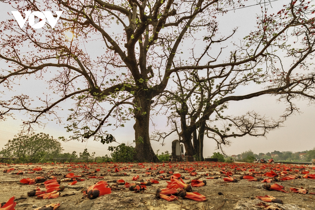 “Những năm trở lại đây hàng hoa gạo không còn nở đều như ngày trước, hai cây đầu làng đã nở xong và rụng gần hết hoa”, bà Hiếu – một người dân thôn Đoan Nữ cho biết. |