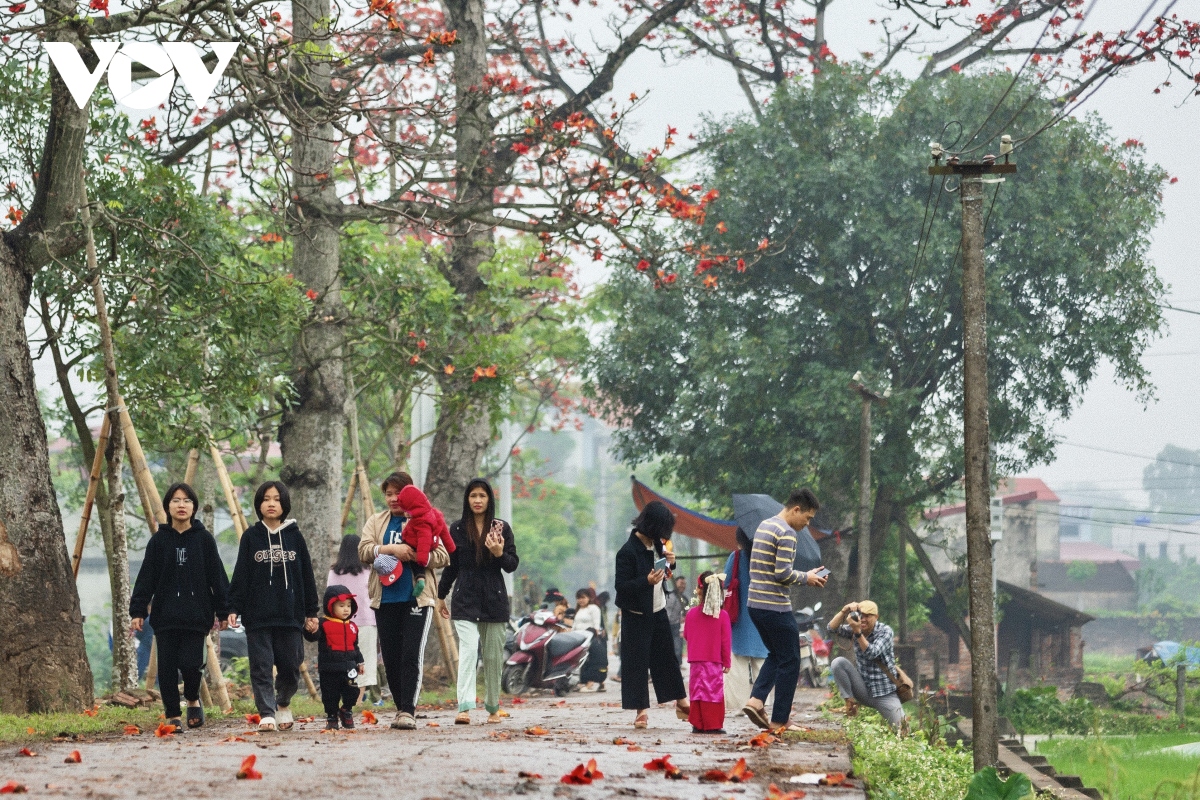Ngày cuối tuần dù thời tiết xấu, có mưa nhưng hàng cây gạo thôn Đoan Nữ vẫn thu hút rất nhiều người tìm tới để “săn ảnh”. |
