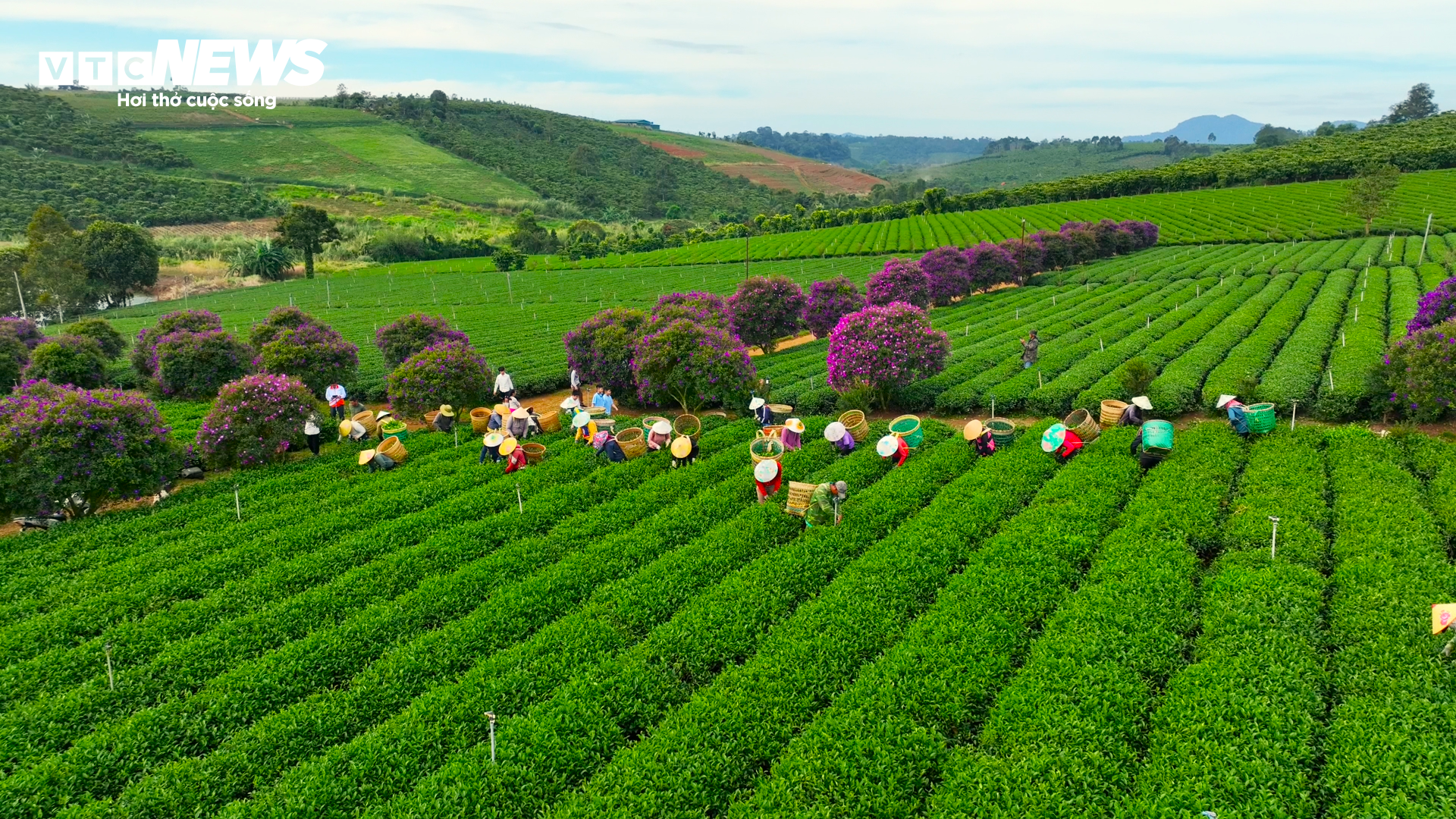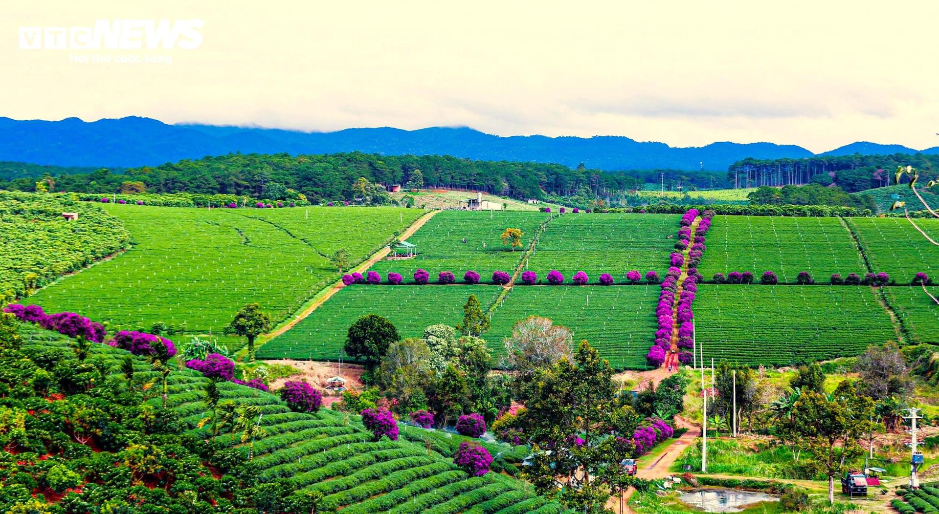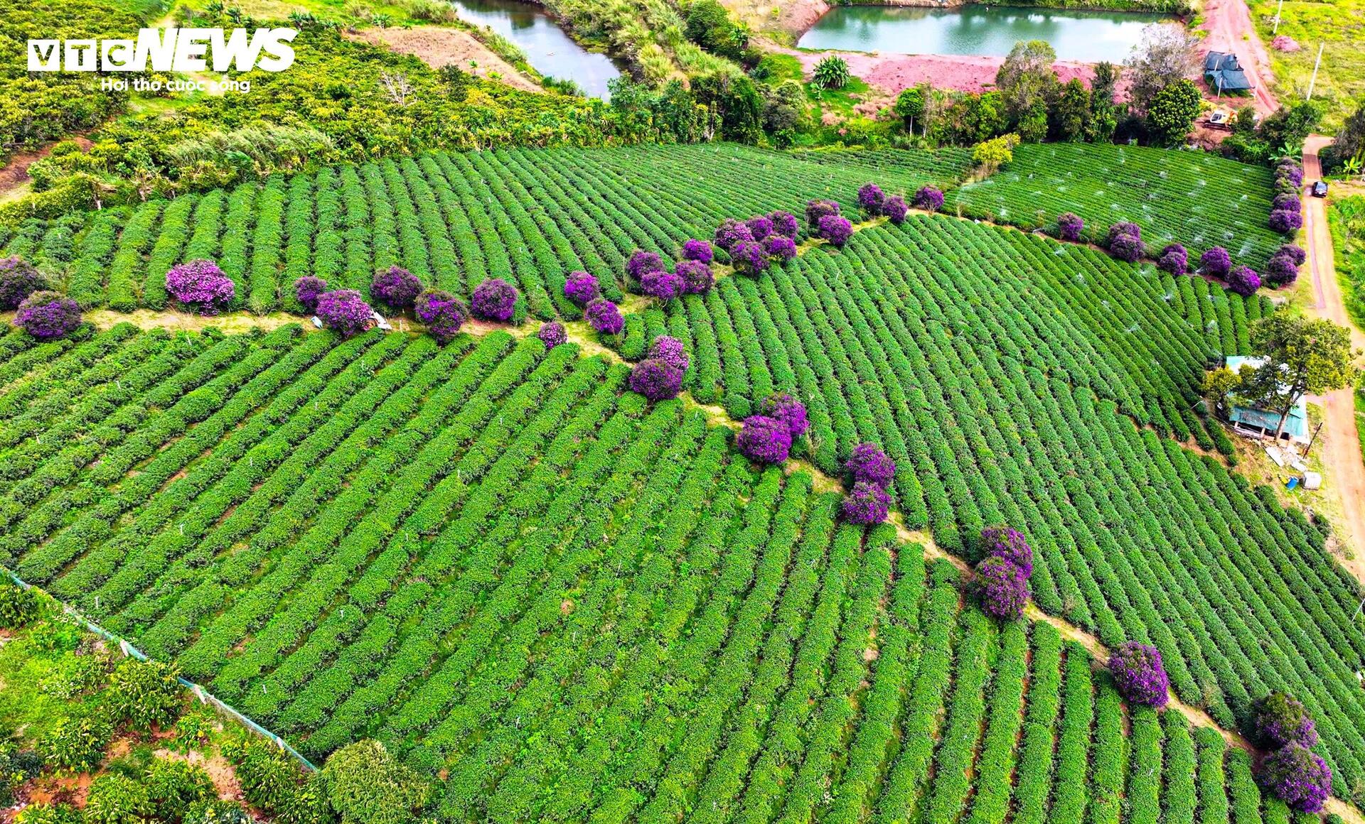 Hoa mua nở tím rộ trên đồi chè xanh ở Lâm Đồng.