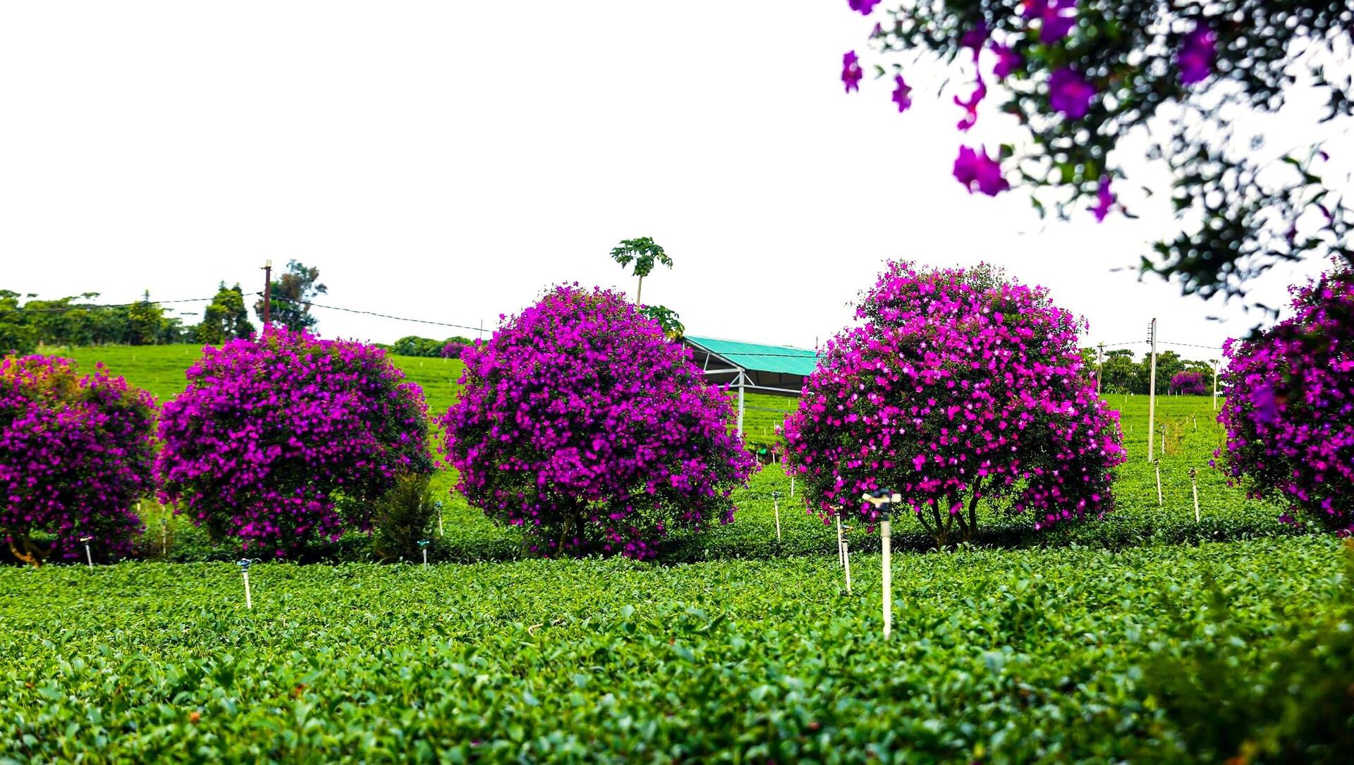 | Nơi đây có đến hàng trăm cây hoa mua tím được trồng thẳng hàng trên những lối đi tại nông trường chè xanh đang thời kỳ đua nở, điểm tô sắc tím cho nông trường chè rộng lớn. |