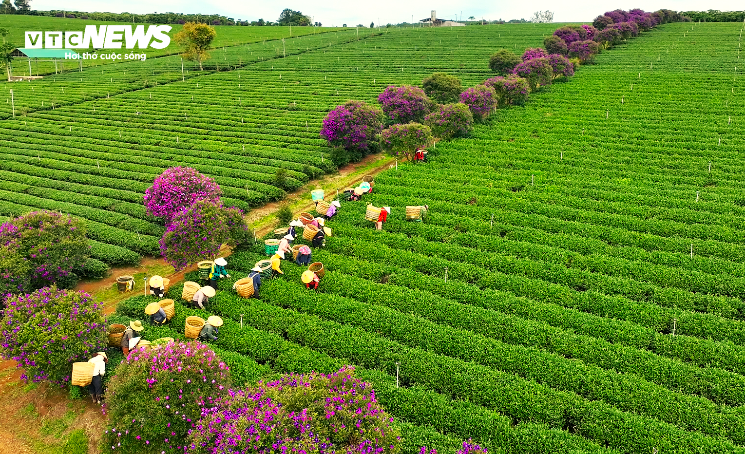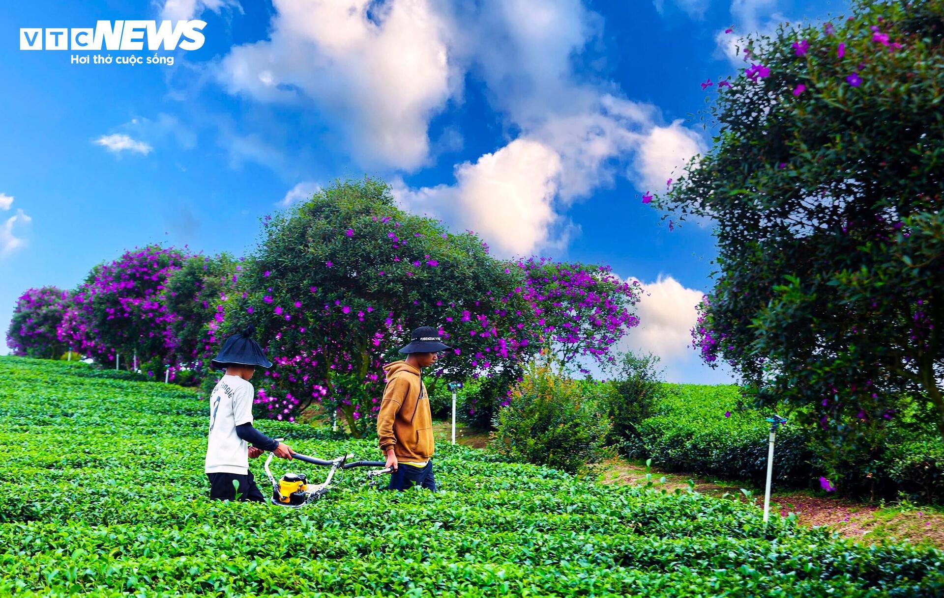 | Sắc tím hoa mua, màu xanh đồi chè và sắc màu từ những giỏ đựng chè của công nhân nông trường đã biến nơi đây thanh một bức tranh đẹp mắt. |