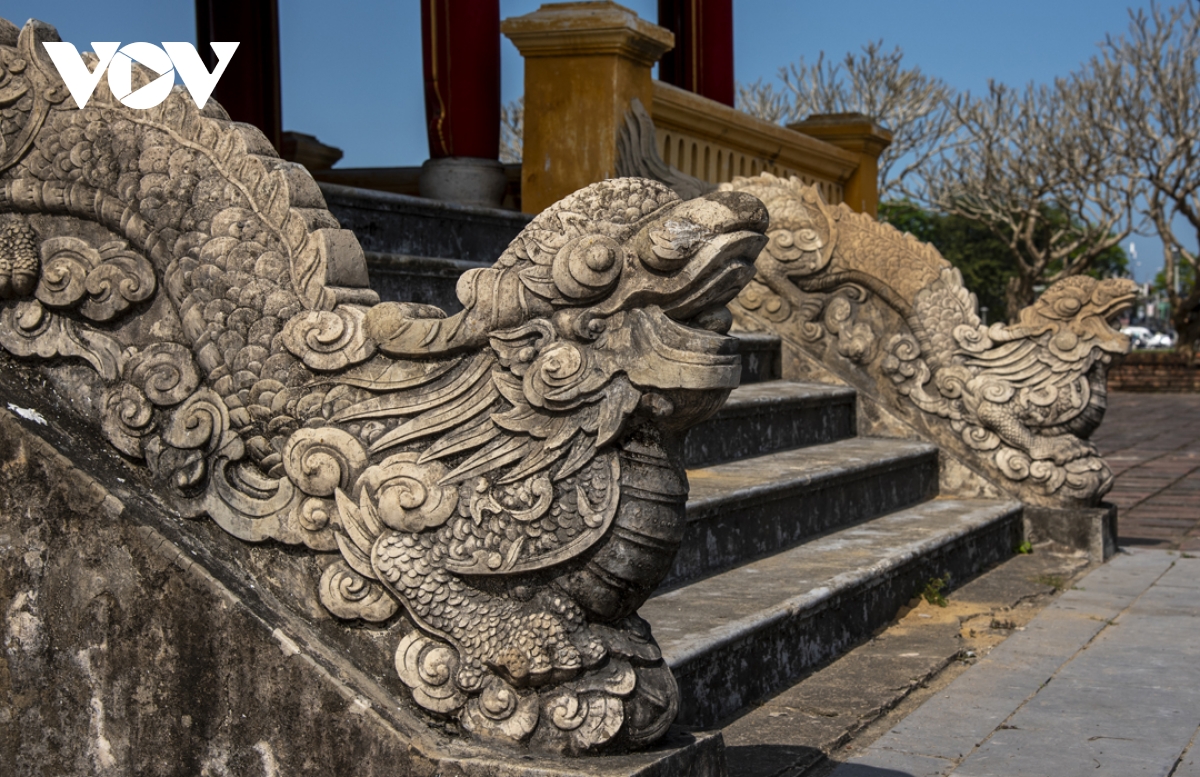 Phu Văn Lâu (hay còn được gọi là lầu Phu Văn), nếu giải nghĩa từng từ thì “Phu” tức là trưng bày, “Văn” là văn thư, “Lâu” là lầu cao, tựu chung là “nơi thông cáo, trưng bày văn thư của triều đình nhà Nguyễn”. Trong ảnh: Đôi rồng chầu ở bậc cấp lên Phu Văn Lâu