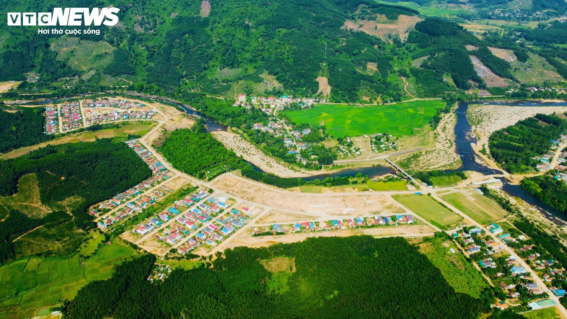 | Nhìn từ trên cao, những khu tái định cư của đồng bào dân tộc Hrê thuộc 2 xã An Trung và An Hưng có diện tích khoảng 80 ha, nằm bình yên bên các nhánh sông An Lão. Để xây hồ Đồng Mít, UBND tỉnh Bình Định đã nỗ lực thuyết phục 480 hộ người Hrê (1.735 nhân khẩu) thuộc xã An Dũng thực hiện một cuộc “đại di dời” đến nơi ở mới trên. |