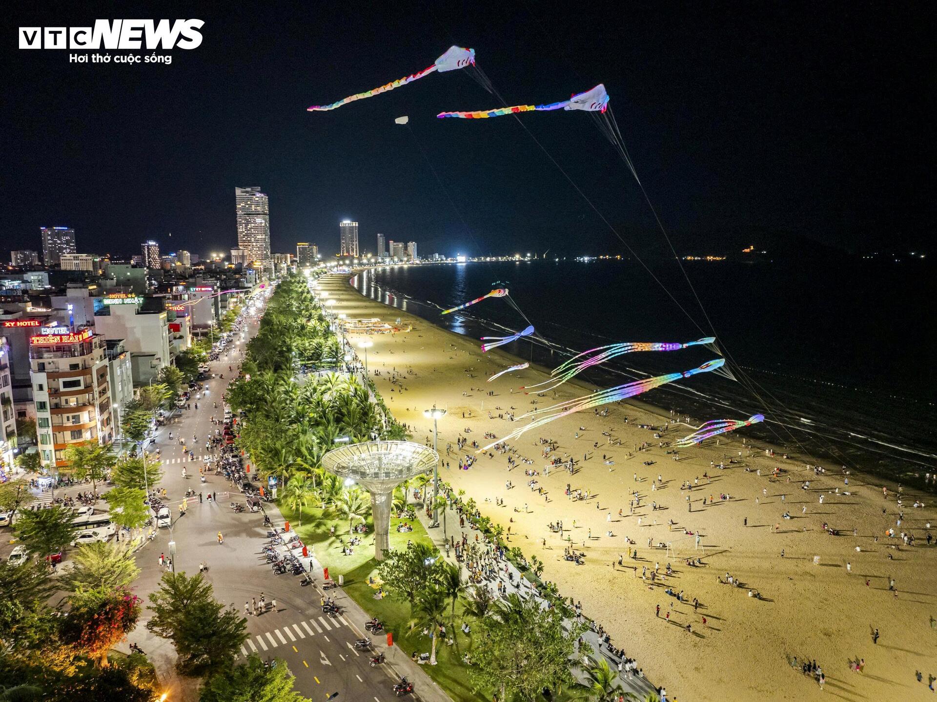 | Dòng người đi bộ và vui chơi trong bầu không khí trong lành, trên những con đường biển sáng bừng, trên cao là những cánh diều căng gió, tạo nên bức tranh sống động về đêm. |